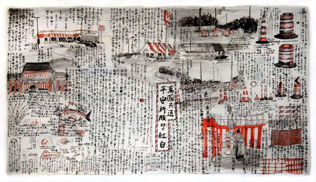 The Time Traveler Umeyama’s Report: The Sacred Red and White, 2015, Sumi ink and gouache on oriental paper, 22 x 40 inches