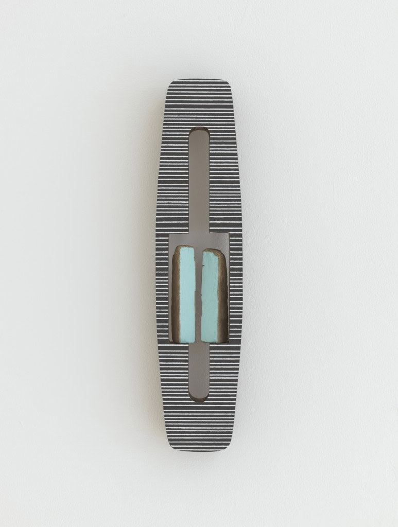 Second Sight (Illuminates), Am Skógafoss-Wasserfall (Island) aufgesammelte Holzobjekte, Farbe, gratis Geschenkpapier aus dem Kaufhaus Illum in Bergen (Norwegen), Passepartout, gefundene und modifizierte Holztischfüße, Eiche, Ölfirnis, Stahldübel, 50 x 12 x 5 cm, 2011/2015, Foto: Bent René Synnevåg, Courtesy Entrée, Bergen