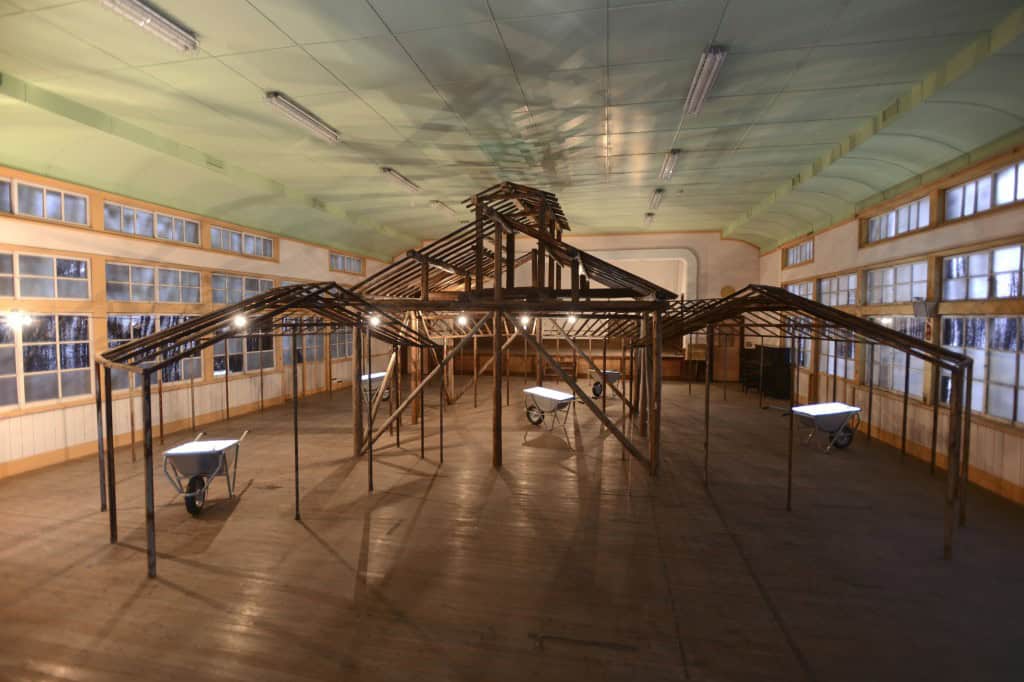There is no smoke without fire, 2013, Holzhütte, Glashaus, Einrad, Fotodruck, landwirtschaftliche Werkzeuge, 1100 × 1800 × 5500 ㎝ (Installation), Foto: Kimito Takahashi
