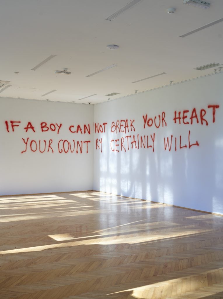 Semir Mustafa, IF A BOY CANNOT BREAK YOUR HEART YOUR COUNTRY CERTAINLY WILL, 2021, Graffiti, 840 x 100 cm, Gallery Klub, Centre for Contemporary Art Montenegro. Courtesy the Artist. Photographer: Duško Miljanić