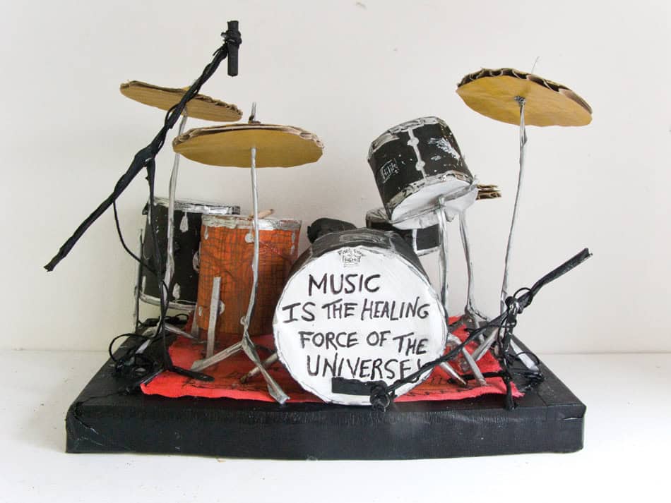 The world of rock music and fan culture is the focus of Rose Eken’s artistic practice. Using a wide array of media such as ceramics, embroidery, video, watercolour painting and miniature models, Eken (re)constructs scenarios borrowed from rock music and culture. But rather than creating faithful copies, her works play with scale and proportions to distort reality. The artist thus crafts a drum kit as a miniature cardboard copy, inflates a grubby, revised set list as a large cross-stitch embroidery on lush silk fabric, or remodels a roll of duct tape and a beer can in glazed ceramic. Eken makes a show of the mess and the waste – the cultural debris – left behind after a recording session or a club gig. By portraying the rebellious rock culture so zealously and with such atypical materials, she partly deprives it of its masculinity and bestows it instead with an arguably feminine attention for detail. Eken toils with her embroideries in much the same way a guitarist picks his guitar. And she succeeds in transforming the ephemeral and fleeting into art objects replete with intrinsic references which extend far beyond the individual set list, can of beer, cigarette butt or half-eaten kebab. (Excerpt from: Maria Kjær Themsen, REmake/REmodel. Rose Eken 2008–2010, 2010).