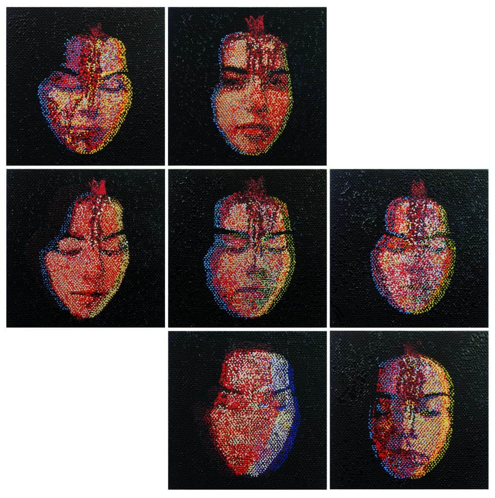 I am currently investigating the concept of environment and its influence on humankind between reality and virtual reality. I look at how vicarious living through the media influences the thoughts, perceptions, progress and understanding of our own selves in regard to what is happening simultaneously around us, and how our actions or mere observations are affecting our own lives and the lives of others. In my self-portraits, the faces seem cold and unresponsive to the catastrophic events that are happening, relating to the fact that the media cause a desensitising effect on people, making them no more than spectators to the events they portray. The technique I use consists of glass paint on canvas. The forms are entirely created by applying the paint in pixel-like dots, sometimes on a painted background. I occasionally use mixed media to make the base.