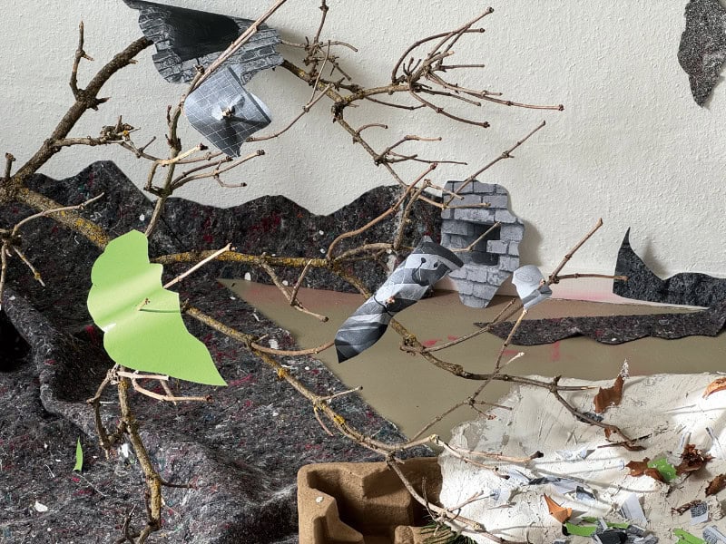 The installations by Taiwanese artist Chia-Yi Chen (born 1992 in Taipei, Taiwan, lives and works there) appear like miniatures of urban landscapes. This impression becomes all the clearer when one realizes that the materials the artist uses are actually by-products of urban life: Styrofoam packaging, waste paper, painter’s fleece. Only a few objects are recognizable as having been produced for the purpose of viewing. Recurring motifs, however, are holes and tears. Chia-Yi Chen found these on her walks through Berlin, photographed them and distributed them on her installations and on the wall. The sight of such architectural wounds is probably commonplace – almost omnipresent – for many Berliners. Building sites, bulky rubbish, crumbling plaster and gaping holes have almost become part of the city’s iconography. For the artist, however, they are an indicator of the history and dynamics of the city, whose structure is constantly changing, whose skin stretches, hardens, cracks, bleeds and scabs.