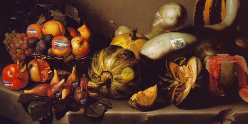 Her Früchtlinge exhibition project at Künstlerhaus Bethanien showcases her reflections on migrants and refugees. She visited a range of initiatives for refugees in Berlin to learn about how they see our society, which is foreign from their perspective. The works resulting from this experience address our frequently ambiguous attitude to what is foreign to us: whereas “exotic” luxury items and food such as tropical fruit are regarded as positive and precious, people who come to us as refugees from the same countries are often rejected as being “foreign”, and their “exotic” nature is sometimes even perceived as a threat. Nurvista portrays this ambiguity with subtle irony, for instance by affixing contemporary official quality seals and brand labels to Old Masters still life paintings or historical pictures of the “noble savage”, thus adding a humorous and critical layer of meaning and turning them into new, independent pieces of work. Her show also includes a number of small sculptures made from a rough dough of flour, water and salt and modelled on the grand archways and portals portrayed on euro banknotes that symbolise Europe’s outward-looking character and readiness to cooperate with the international community.