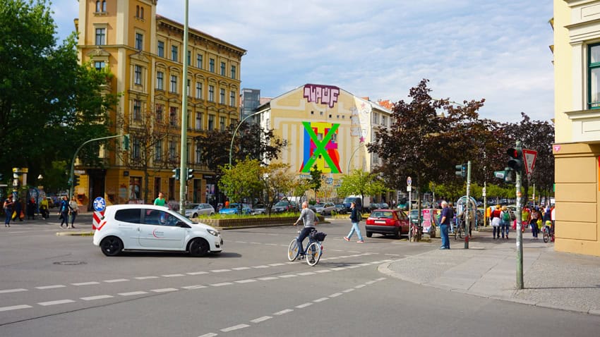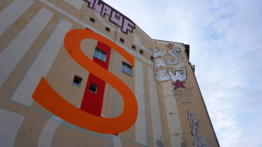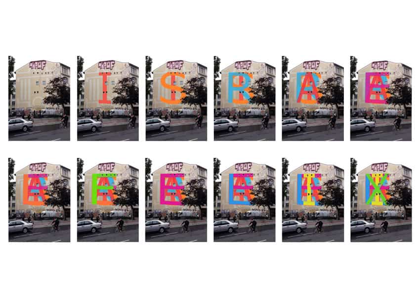 “I will write Felix Israel’s name on the house facade. Letter for letter. Eleven in total number. The letters will not be placed next to each other but will be painted upon each letter. Hereby every letter covers and erases the letter underneath. In the process I will begin with the surname Israel that combines the entirety and will end with the name Felix, referring to the individual, the subject. The final result is a picturesque almost abstract letter-structure from which the names cannot be deduced at first sight. The last two applied letters that emerge from the letter-continuum are the letters I and X, the X basically removing the I underneath it – the self and together the whole building. The act of retaining and erasing a name brings to mind the subject’s extinction while becoming a symbolic act together with the building’s disappearance and giving this mural its meaning.” (Erez Israeli, project proposal)