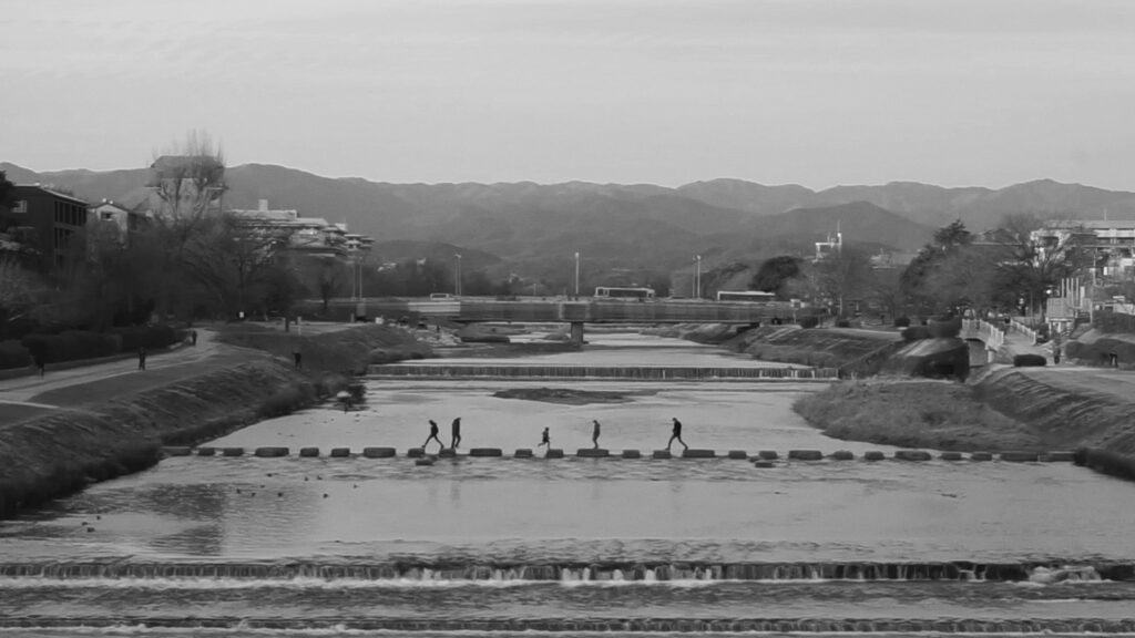 In February 2020, Jess Lau Ching-wa began filming the people of Kyoto as they crossed the Kamogawa River over the historic stepping stones. Positioned at Nijo Bridge, she recorded every time someone stepped down the slope to the stones and stopping when they left the frame. In the background, the viewer glimpses a modern bridge full of motorised vehicles, illustrating the difference in speed and rhythm. By capturing a total of 100 people crossing the river, the artist creates a subtle portrait of Kyoto’s population and their archaic patterns of movement.