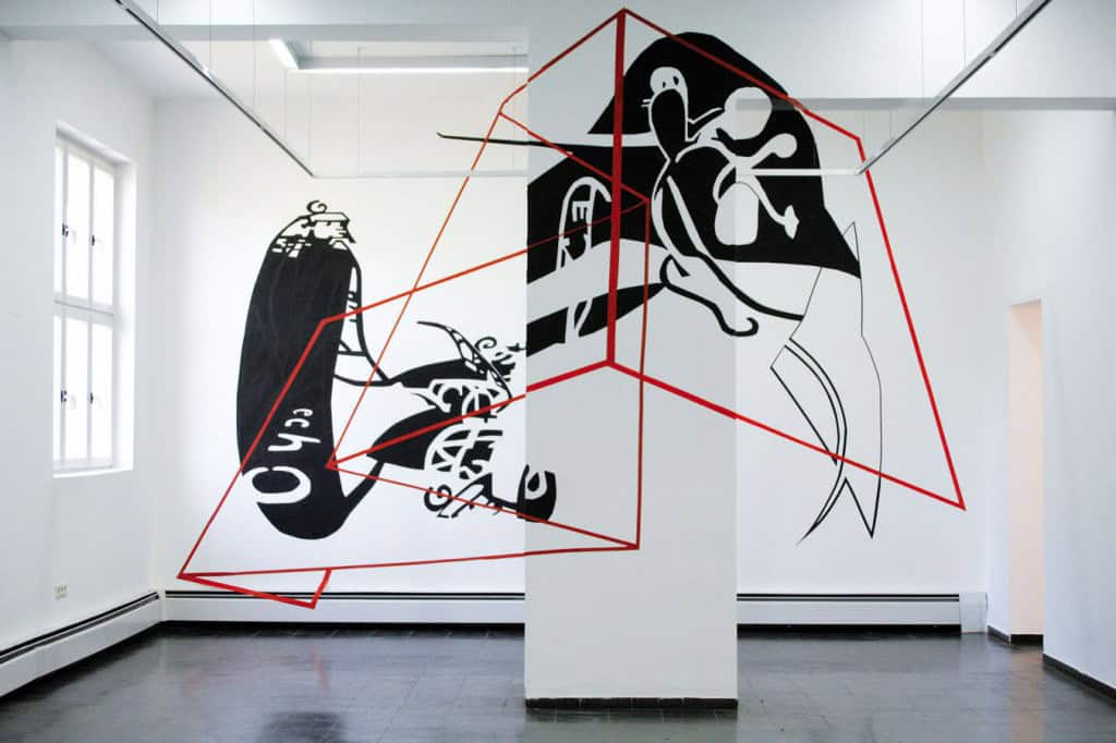 In Künstlerhaus Bethanien Mandernach is showing a selection of large-format cut-out silhouettes under the heading mutabor, and transposes them into a situative installation on the spot, employing sticky tape to echo elements of the space drawings. An animation film will also be shown, taking up the leitmotif of mutabor – a quotation from the famous fairy-tale Caliph Stork.