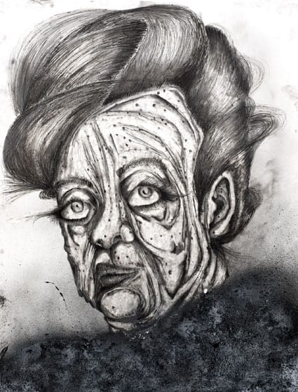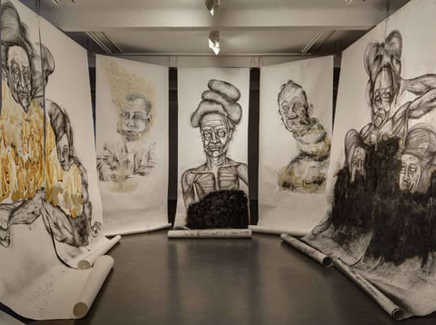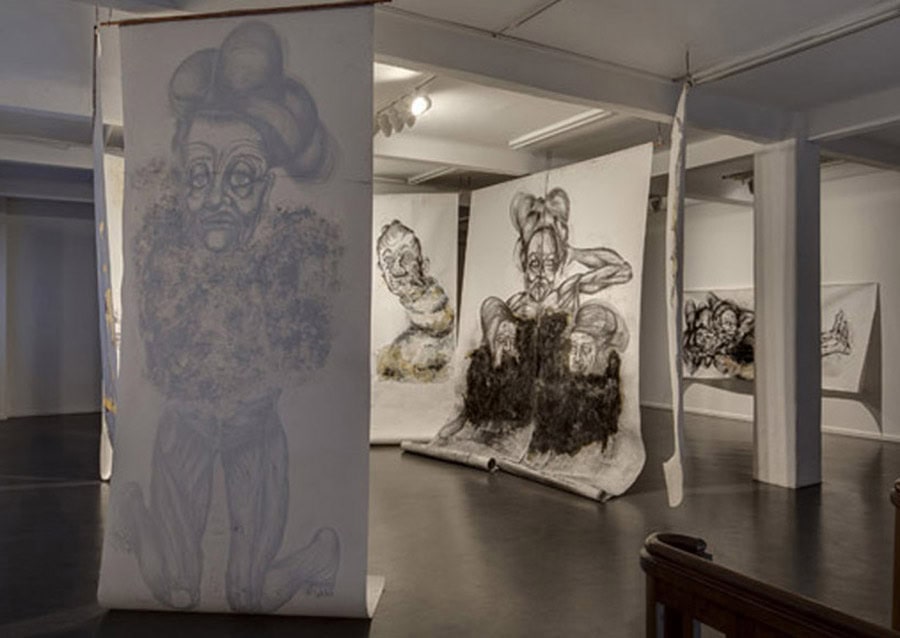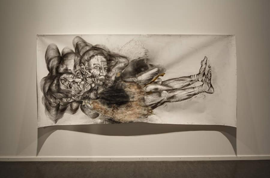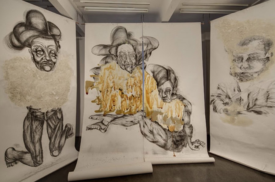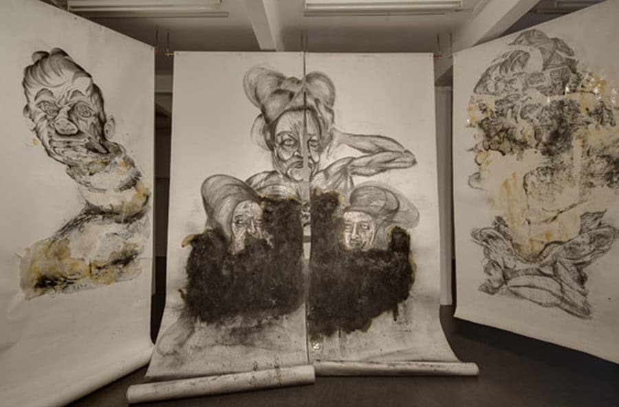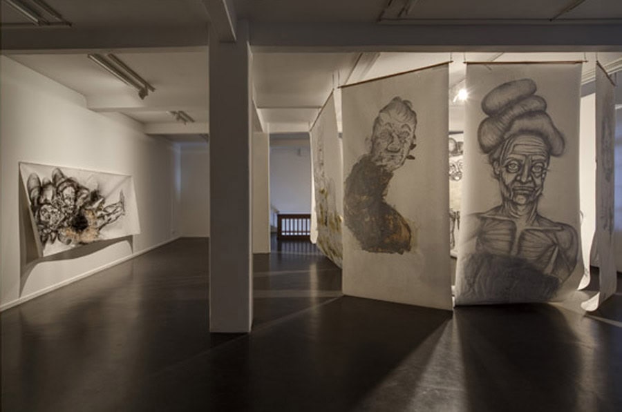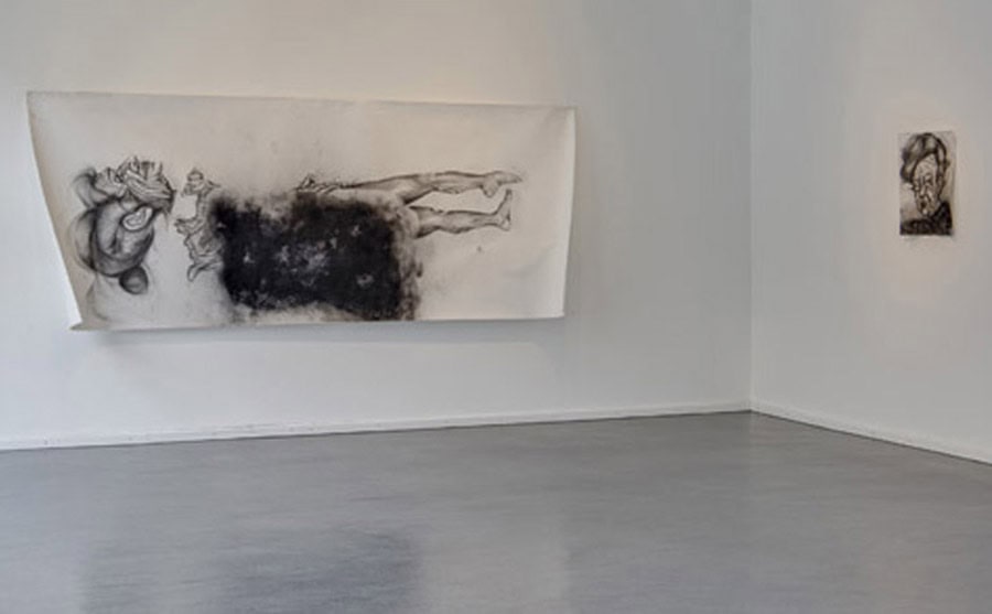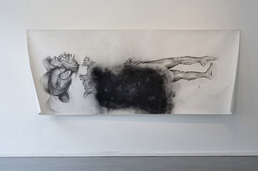 The key work of his current exhibition is The Teacher’s Nap (2011), Heifetz’ first horizontally oriented drawing. It shows a long, stretched-out figure – the teacher – lying down at a moment of relaxation and thus loss of control. Heifetz’ work consciously creates ambivalence and leaves the viewer uncertain whether the recumbent woman is asleep or already showing the first signs of physical deterioration in death. He creates a floating state between alertness and sleep, life and death – and so hits on that cathartic moment when the process of losing control and separation from reality begins. On the upper floor of the gallery space the visitor is then truly overwhelmed by a remarkable installation comprising oversized drawings arranged as a kind of walk-in ‘cabinet’. The figures seem simultaneously strong and vulnerable, radiating as much glamour as decadence: here, they enter into an intense relation with the viewer, so involving him/her in the associative interplay of the characters that Heifetz represents.