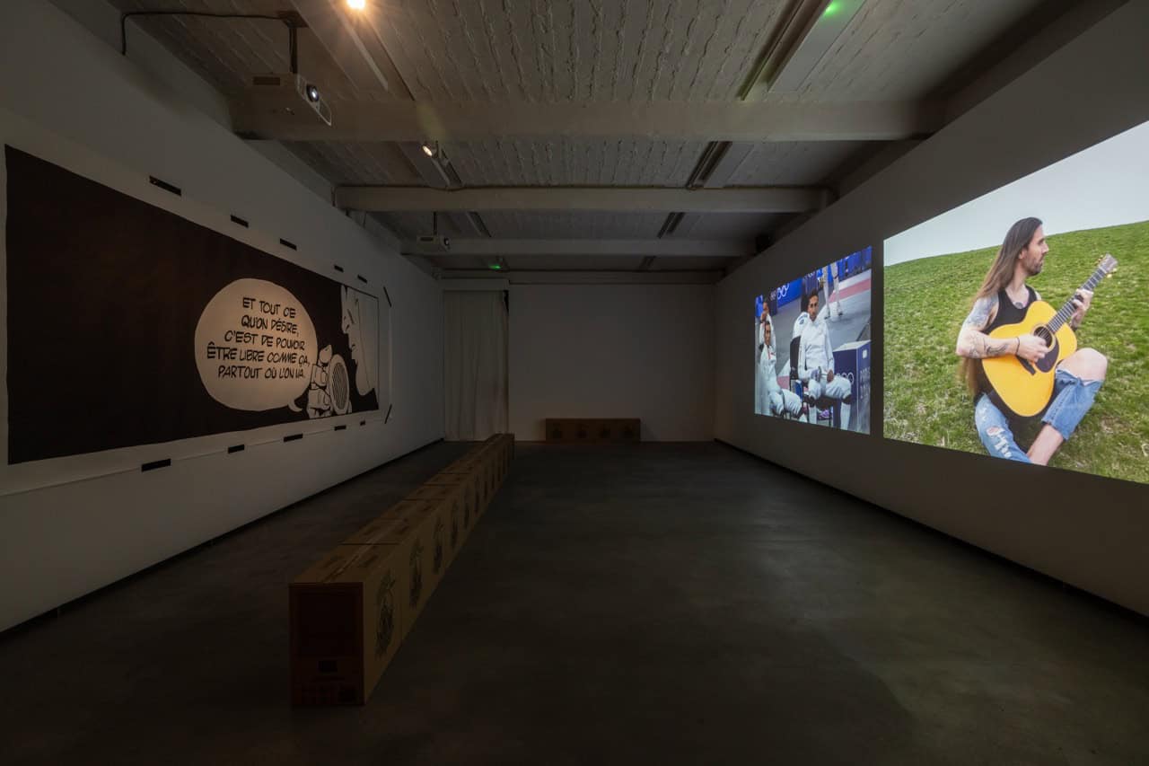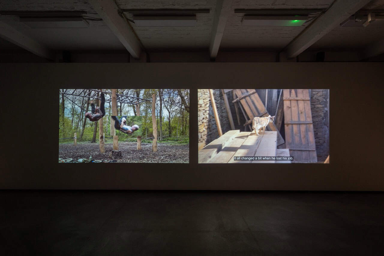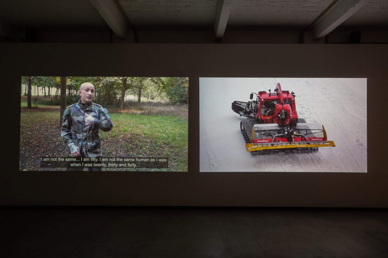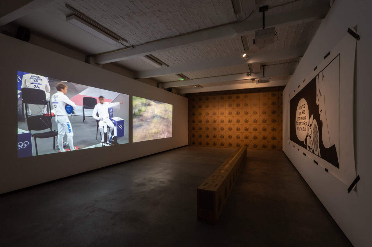 Sja Mægre, the multi-channel video work at the center of the exhibition Skinny Cat, is illusory in its goals. Its cryptic title is derived from the phonetic spelling of the french term, chat maigre, in Danish. One screen shows ambient imagery of fencers competing in an Olympic arena, enclosed by fencing and security barriers, overseen by referees. The video cuts to an ad hoc portrait of Gérard, a former legionnaire of the French Foreign Legion, as he trains in a park. As Gérard demonstrates his diligent training regimen, he begins to recall memories of serving in the Legion—an elite corps of the French Army shrouded in myth, known for its strict discipline, strong esprit de corps, and worldwide deployment in advanced warfare. Recruits undergo intense physical training and often adopt new identities (indeed, Gérard is not his first—or original—name). To become a legionnaire, he explains, is to assume not only a new body but a new personhood—one that mutates over the course of a career. “I am not the same…,” he muses at one point, reflecting on his advancing age. “I don’t have the same spirit and body.” Ongoing physical training, however, becomes a way of indexing continuity between these bodies over time—even, or especially, when his career as a soldier has ended, and all that remains are memories.