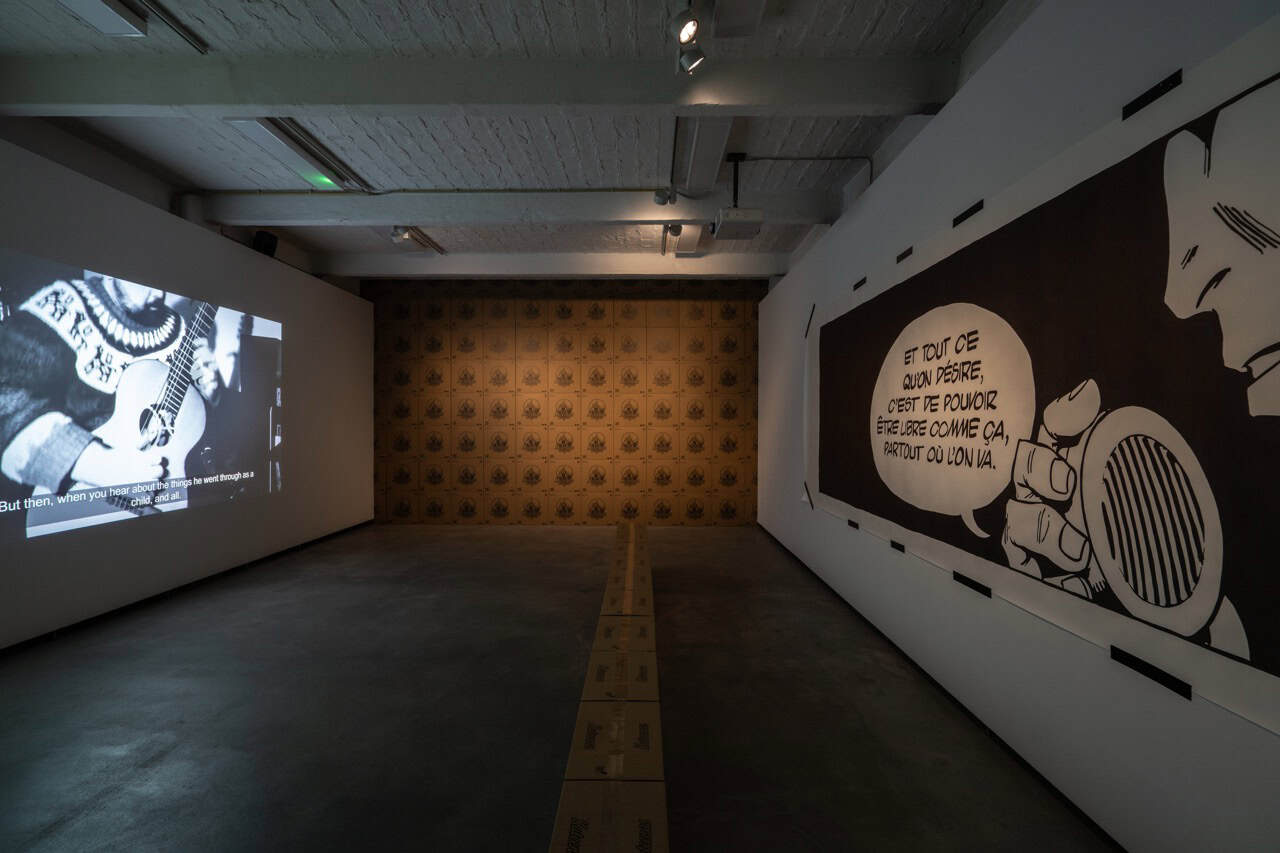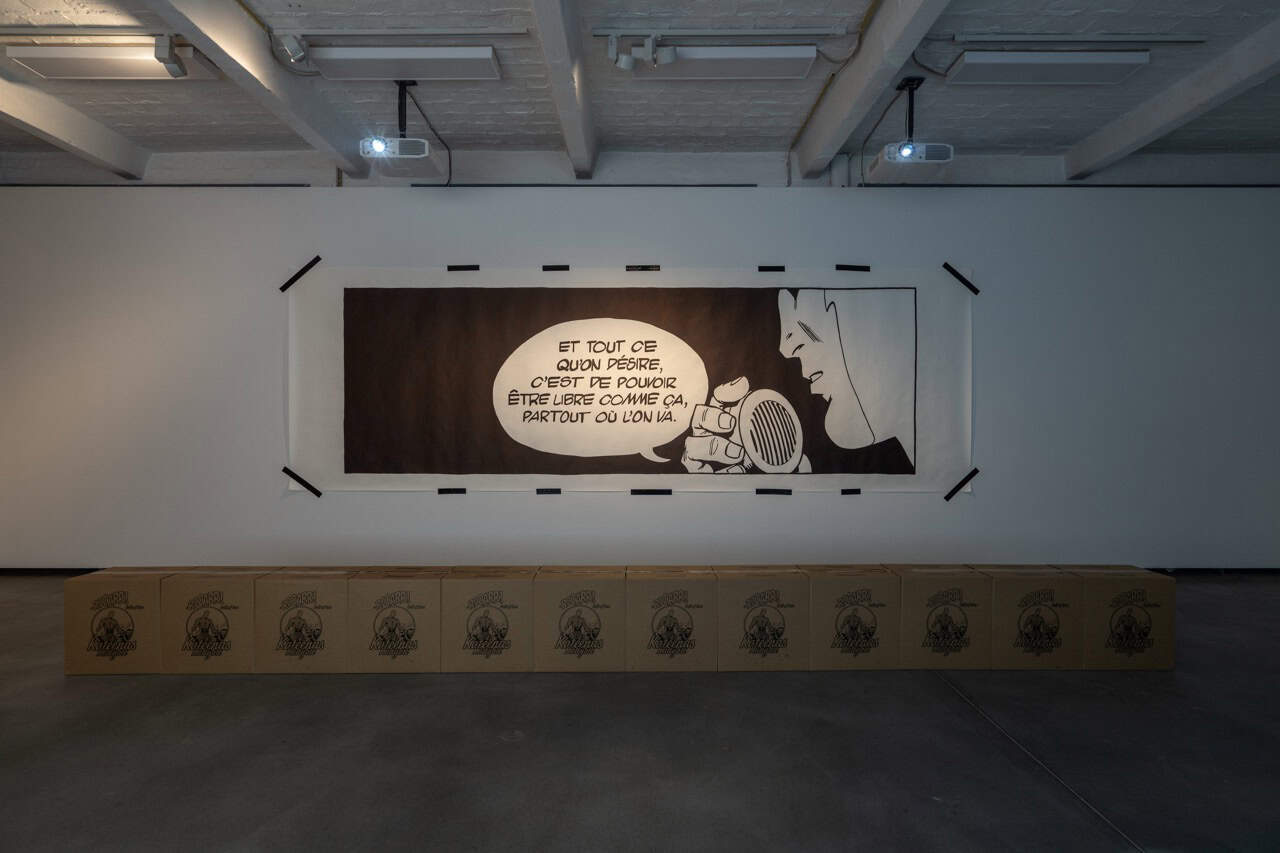 Here, Møhr offers the beat as an deeply compelling social metaphor: as a structuring force of affect, trauma, and empathy. Like scientific time, synchronization cuts across space and distance, across media and ideology, across experiences of self—even, and especially, the film suggests, experiences of loneliness. For Sja Mægre’s beat seems to come to rest in Gérard’s body: time is both in and of the body. The beat is pure repetition, which for Freud was a psychic compulsion, a technique of trauma. It also extends as an acoustic backdrop throughout the exhibition, which includes a series of ink drawings depicting the comic-book hero The Phantom, sourced from the artist’s extensive collection. First published in U.S. newspapers in 1936, The Phantom has since appeared in more than 500 newspapers, translated into 40 languages, with an estimated daily readership of 60 million. As a massively distributed representation of the crime-fighting hero, The Phantom approximates a pop-culturally universal mythos of masculinity. His lair is famously located inside a cave, where he in solitude awaits the world in need of saving. He may be understood as a nostalgic media memory, a form of generational subconsciousness, a template, or a literal phantom: a ghost haunting the bodies assembled in Skinny Cat.