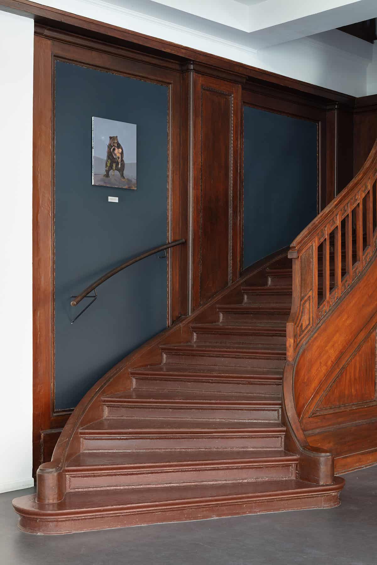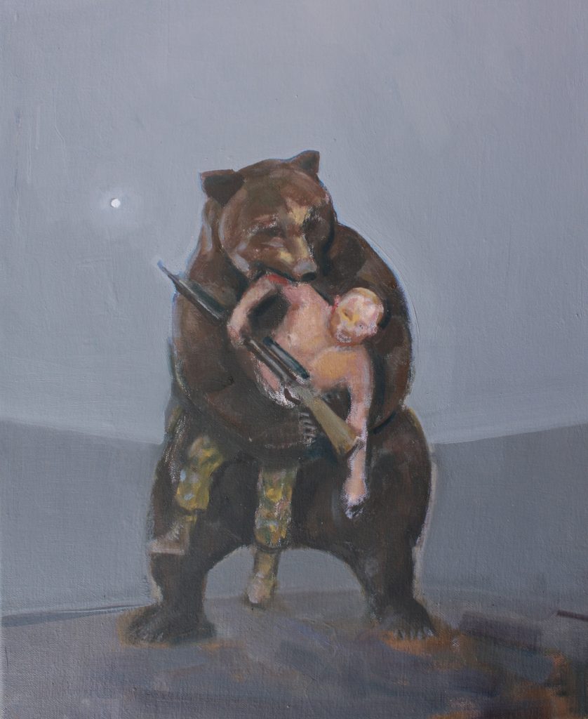 Çelik’s small-format painting “Komm nach Hause” was created directly under the impression of the Russian invasion of Ukraine. It shows a full-grown bear that has grabbed a marksman by the upper right arm with its mouth and is lifting him off the ground with one paw. The marksman, dressed only in army pants and boots, holds a precision rifle in front of his bare torso. He is easily recognizable as Russian President Vladimir Putin, just as the latter has had himself photographed several times as a wiry macho and nature lover, riding or fishing, for representative purposes.