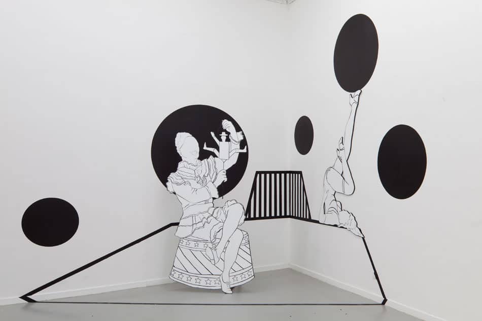 Ahalouch’s “The Greatest Show in the World” transforms the exhibition space into the abstracted image of a circus, encompassing murals, painting and installations as well as performance elements. The exhibition is based on Ahalouch’s research into the infamous “Salon Kitty”, a high-class brothel in Berlin which was frequented by prominent Nazis, local eminence and foreign diplomats from the 1930s onwards, its Jewish “madam” Kitty Schmidt being forced to spy for the Nazis. Ahalouch employs the setting of “Circus Kitty” as a universally valid metaphor for the many harmless and attractive facades that conceal an endlessly complex world full of the lust for power, manipulation and abuse.