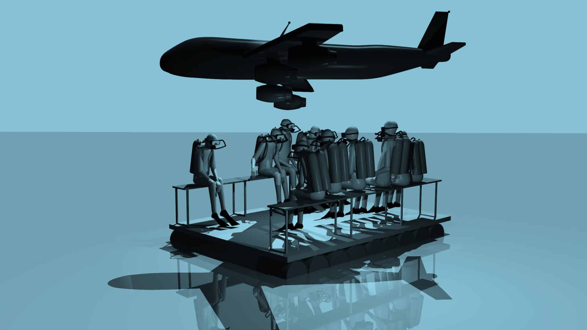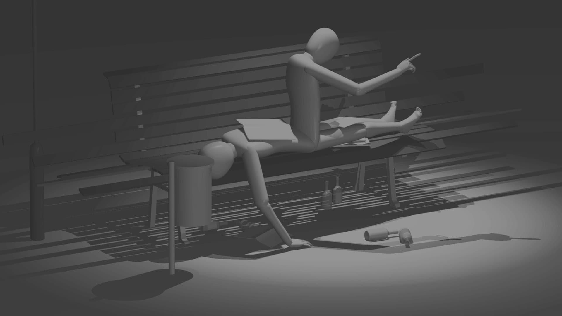 Peripheries of bodies is the second part of a triptych that shows a linearly progressive, yet simultaneously multi-dimensional cadavre exquis. Animated spaces, fuzzy locations and faceless bodies ceaselessly tumble out and fuse along their de-functionalized surface boundaries, which seem to acknowledge neither conventional materiality nor gravity. Both the stripped-down protagonists and their reduced motion trajectories possess an inner irresolution and playful energy that leads them over and over in the course of time to pause in uncertainty at their own destination, finally to fall off the cliff of our existence. While Netzhammer’s aesthetic, almost surgical approach has remained constant since the end of the 1990s, his feverish encyclopedia is continuously broadening in a mixture of global political perspective and universalist social observation.