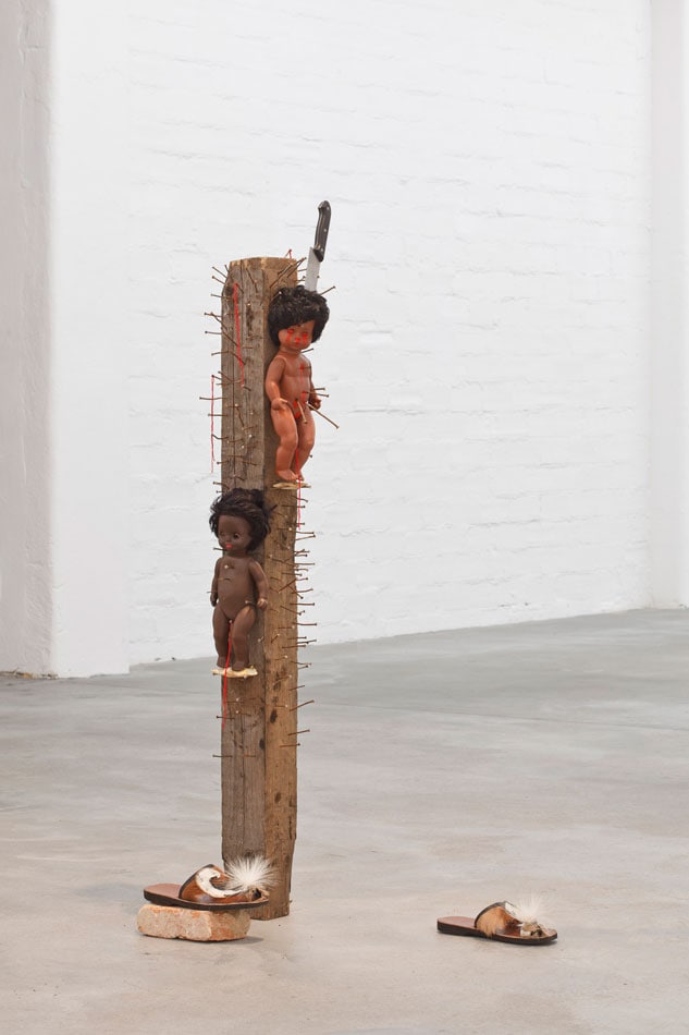 All the installations, mixed-media works, prints and ritual sculptures shown in “Exhitain” have been produced during Yoba Valombola’s stay in Künstlerhaus Bethanien.