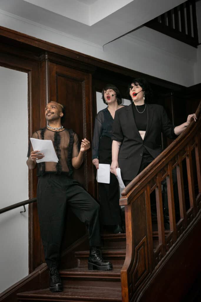 Janus! Janus! Door! Door! , Performance with MINQ, Ania Nowak, Melanie Jame Wolf, exhibition opening, Melanie Jame Wolf, A stage she’s going through (Becoming B), 2025, photo: Galya Feierman