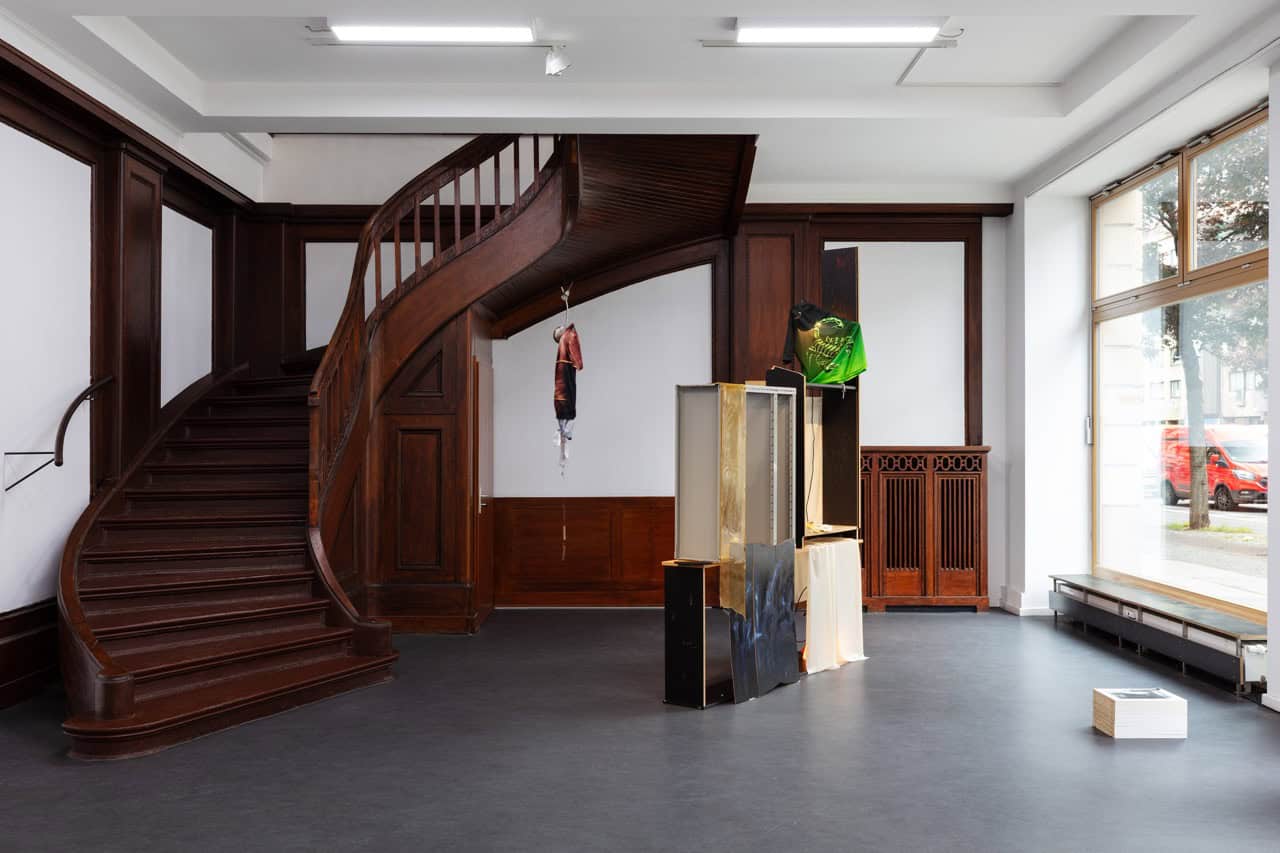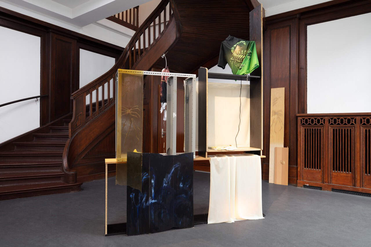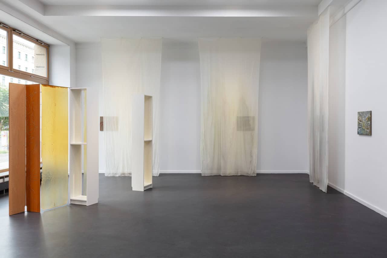 Krys Huba führt in der Ausstellung zudem die künstlerische Auseinandersetzung mit ausrangierten Ikea Billy-Regalen weiter, die dey bereits im Kontext einer Einzelpräsentation bei Mouches Volantes in Köln begonnen hat. Dey zerlegt die standardisierten Formate der Regale in einzelne Fragmente, graviert Texte und Skizzen in die Sperrholzoberflächen, um anschließend Abgüsse dieser Einschreibungen in Latex vorzunehmen. Die Objekte und ihre Negativabdrücke werden von dey in paraventähnlicher Anordnung zusammengefügt und der biegsame, weiche Latex in durchscheinenden orange- und gelb Tönen bricht die strenge Normierung der Regalkonstruktionen auf. So entstehen poröse, durchlässige Konstruktionen, durch die sich die Besuchenden nicht nur hindurch-, sondern auch hineinbewegen – in das Zwischen, in das, was flüchtig bleibt. Immer wieder platziert Krys Huba kleine Fund- und Erinnerungsstücke in die Regalkonstruktionen und schafft auf diese Weise ein vielschichtiges Geflecht aus Objekt, Erinnerung und Narration.