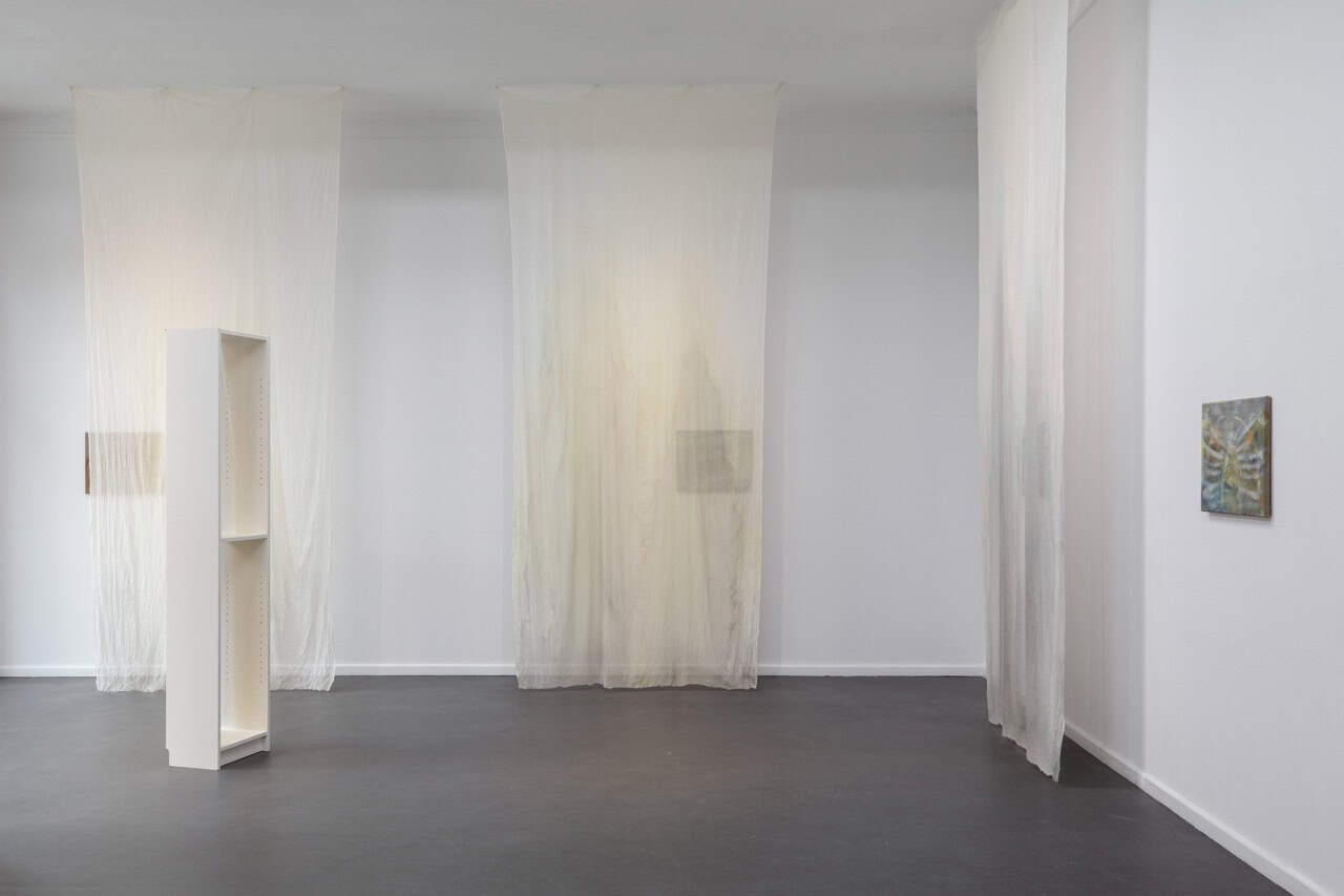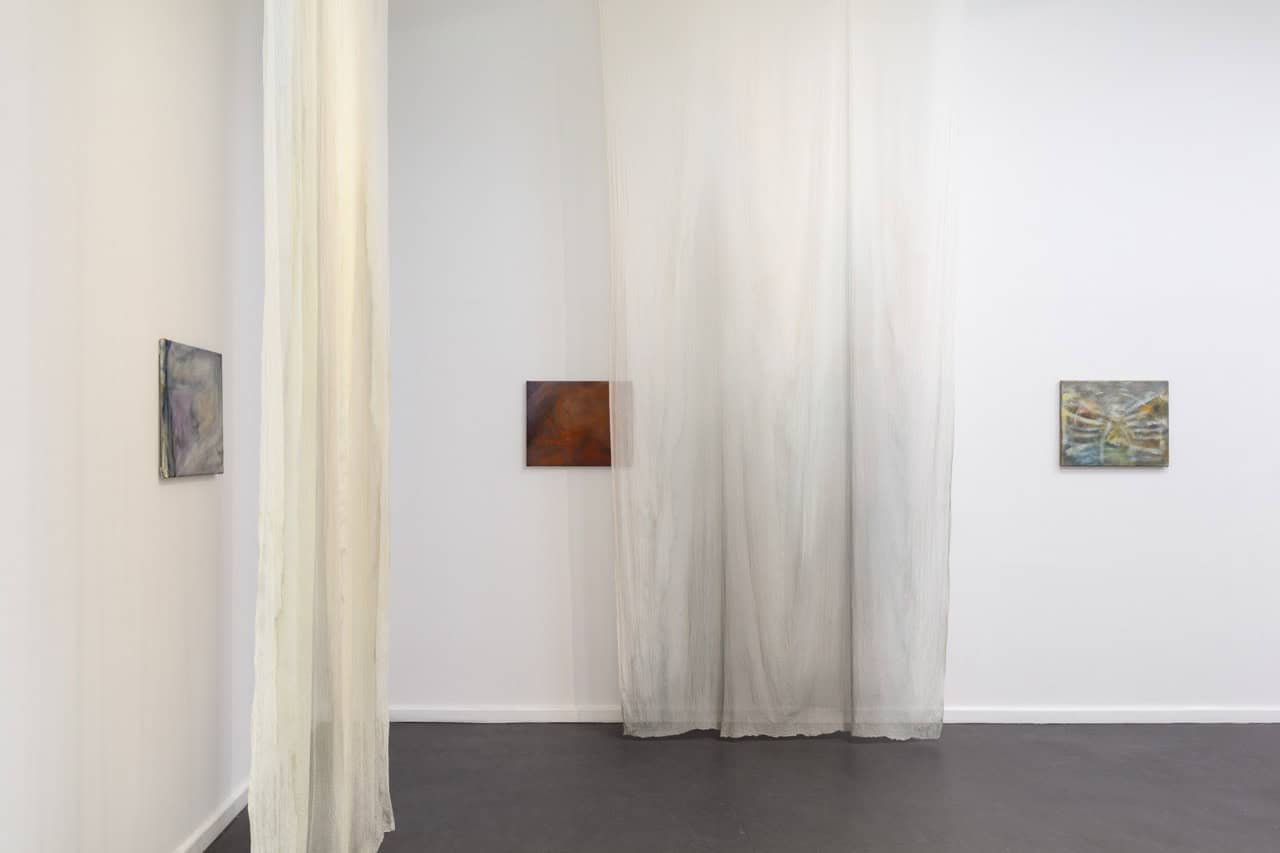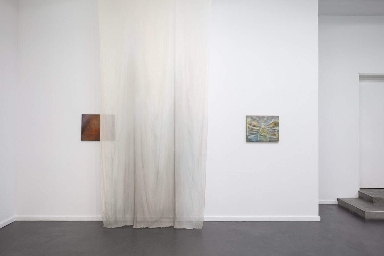 Mittels von der Decke herabhängenden, mit Tusche und Seidenmalfarbe bearbeiteten, transparenten Stoffbahnen weicht Krys Huba im Inneren feste architektonische Konturen auf. In der flüchtigen Materialität des Stoffes beginnen die Grenzen des Raumes zu verschwimmen, sodass er vielmehr als fluides, veränderliches Konstrukt erfahrbar wird, das starre Kategorien infrage stellt und normative Raumordnungen dekonstruiert. In dieses bewegliche Gefüge bettet Krys Huba neue Malereien ein, auf denen Körper in fragmentierter Form dargestellt sind. Oberkörper erscheinen als isolierte Körperpartien, ohne dabei eine konkrete Person oder eindeutige Identität zu repräsentieren. Muskeln, Formen, ebenso wie Narben treten teils markanter, teils zarter, malerisch hervor und scheinen auf der Leinwand sanft ineinander zu fließen.