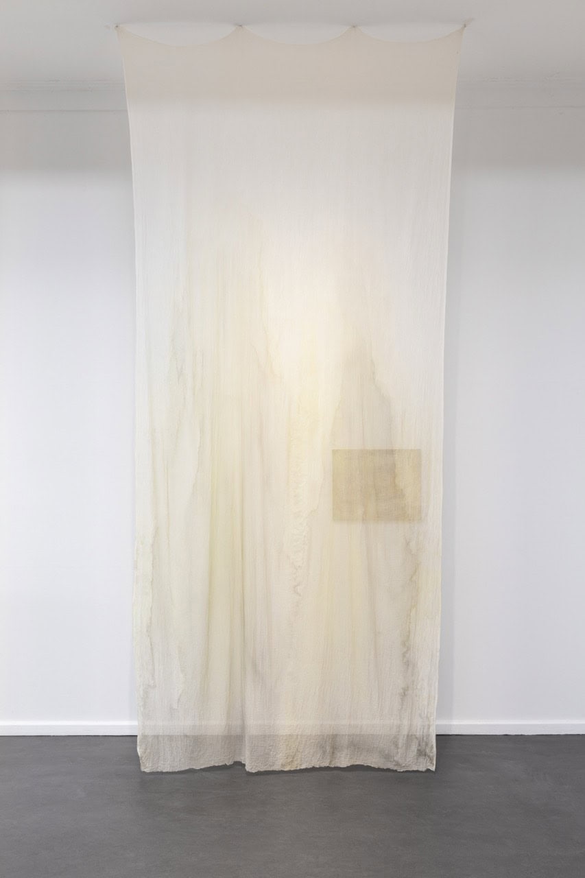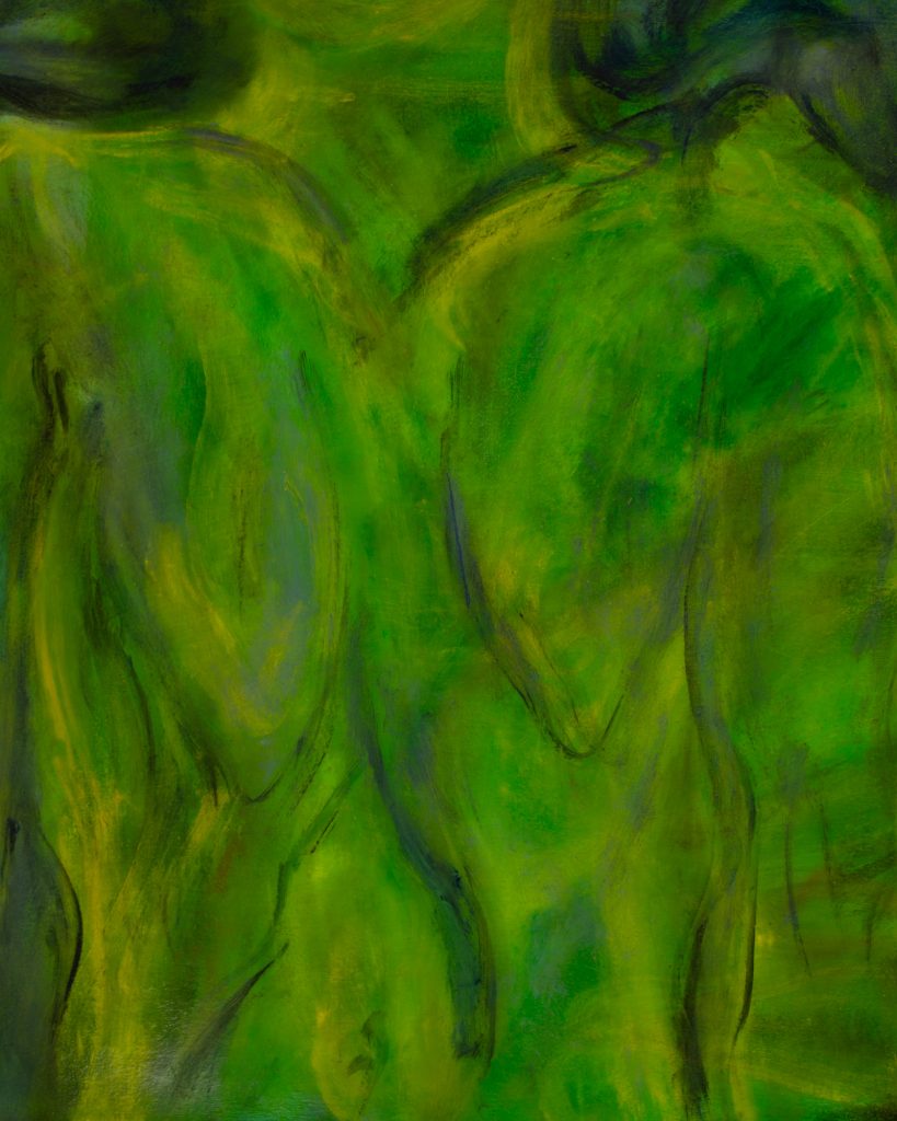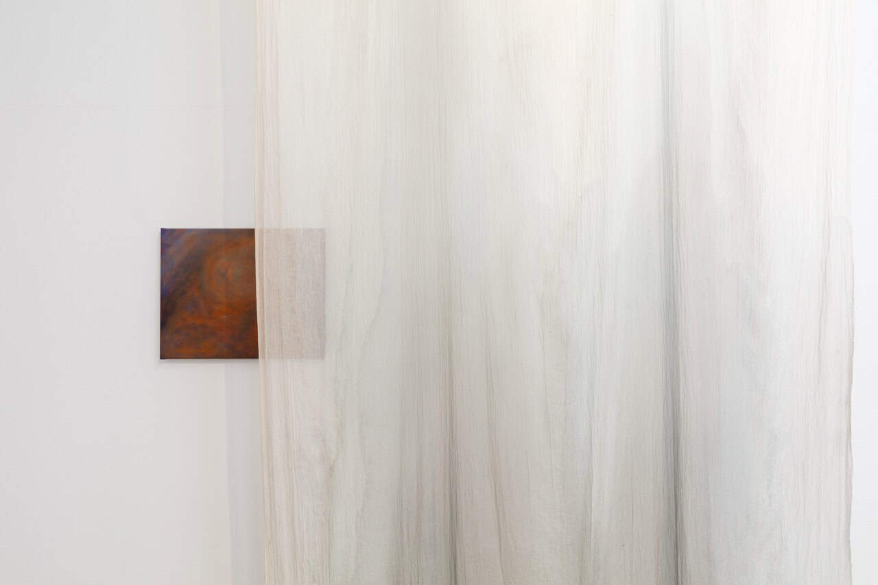 Mittels von der Decke herabhängenden, mit Tusche und Seidenmalfarbe bearbeiteten, transparenten Stoffbahnen weicht Krys Huba im Inneren feste architektonische Konturen auf. In der flüchtigen Materialität des Stoffes beginnen die Grenzen des Raumes zu verschwimmen, sodass er vielmehr als fluides, veränderliches Konstrukt erfahrbar wird, das starre Kategorien infrage stellt und normative Raumordnungen dekonstruiert. In dieses bewegliche Gefüge bettet Krys Huba neue Malereien ein, auf denen Körper in fragmentierter Form dargestellt sind. Oberkörper erscheinen als isolierte Körperpartien, ohne dabei eine konkrete Person oder eindeutige Identität zu repräsentieren. Muskeln, Formen, ebenso wie Narben treten teils markanter, teils zarter, malerisch hervor und scheinen auf der Leinwand sanft ineinander zu fließen.