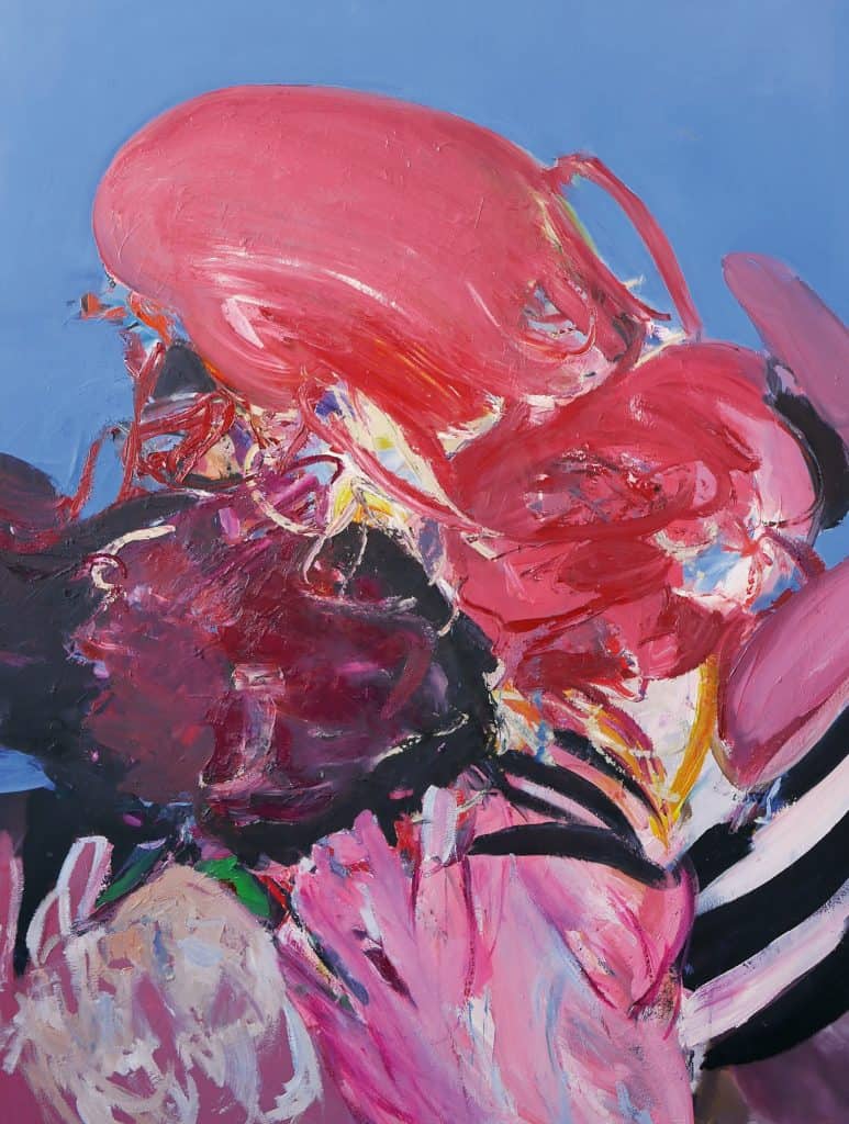 Der zweite Teil der Ausstellung befasst sich mit Dystopien und Kriegsdarstellungen. Wieder sind es runde Formen, Köpfe, Körperausschnitte von Soldaten und Pferden, die sich als abgeschlossene Formen zwischen Chaos, Gewalt und Bedrohung wiederfinden. Die Lebewesen wirken hier eher verloren und allein gelassen, weniger dominant als die Blütenformen in den Pfingstrosenbildern.