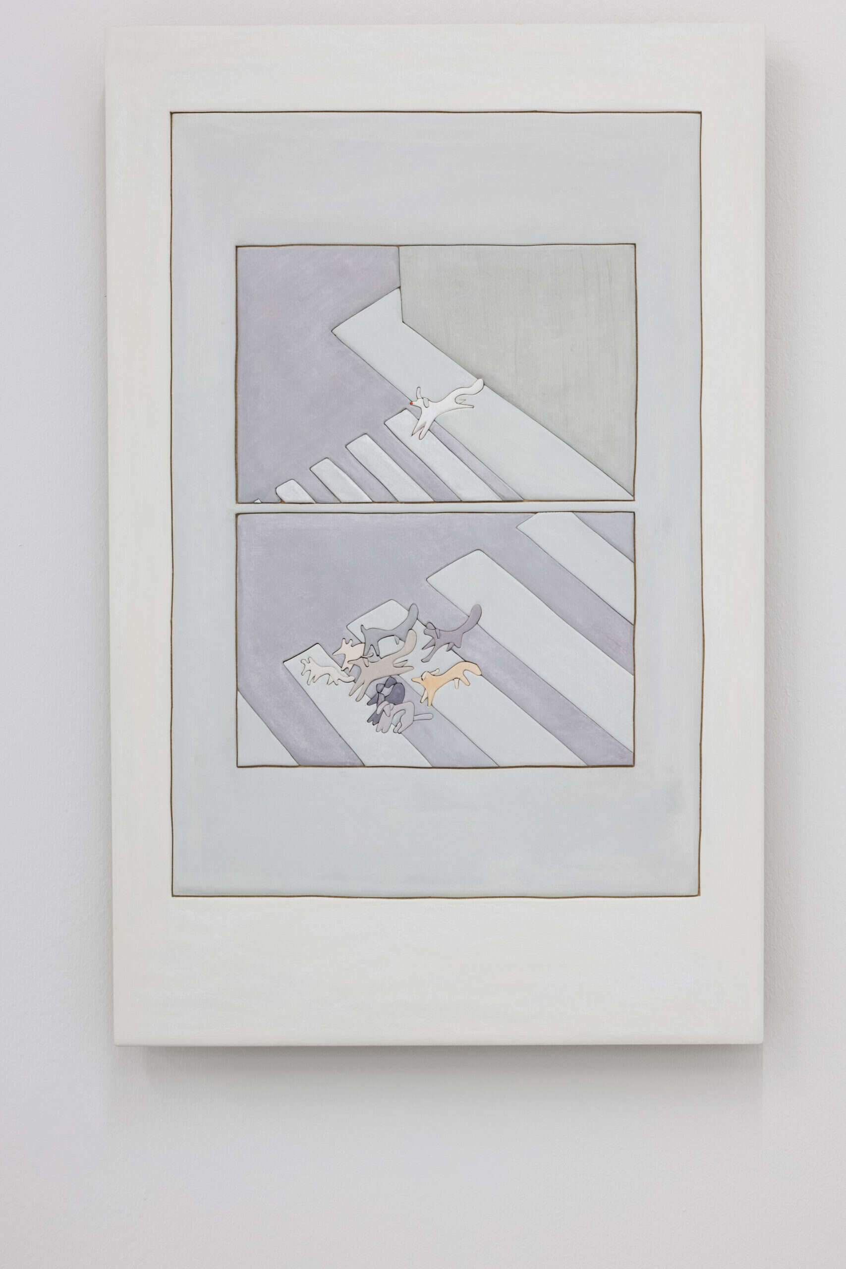 In seiner Ausstellung Backing Vocals im Künstlerhaus Bethanien macht Thomas Schmahl (*1994 in Annecy, Frankreich) diese Schritte rückgängig: Er zerlegt filmische Szenerien in ihre Einzelteile, ordnet sie im Koordinatensystem klassischer Kunstgattungen neu an und bricht dadurch mit Mechanismen erzählerischer Kontinuität. Wir sehen Storyboards, die mögliche Szenen für einen entstehenden Film definieren. In unendlichen Wiederholungsschleifen zirkulierend, gibt es in diesen Darstellungen kein eindeutiges Vor- oder Nachher, nur einen Augenblick. Wie bei einer Geschichte, die wir mittendrin aufgreifen, befinden sich alle Ausstellungsstücke in gewisser Weise gleichzeitig innerhalb und außerhalb einer möglichen Szene. Die Straße, die Landschaft, die Radioklänge, ein Hunderudel: all diese Bruchstücke einer Handlung sind immer in Bewegung, bilden ein Universum zahlreicher Wahrscheinlichkeiten, rütteln an unserer Alltagswahrnehmung und verkomplizieren das Ursache-Wirkung-Prinzip auf humorvolle Weise.