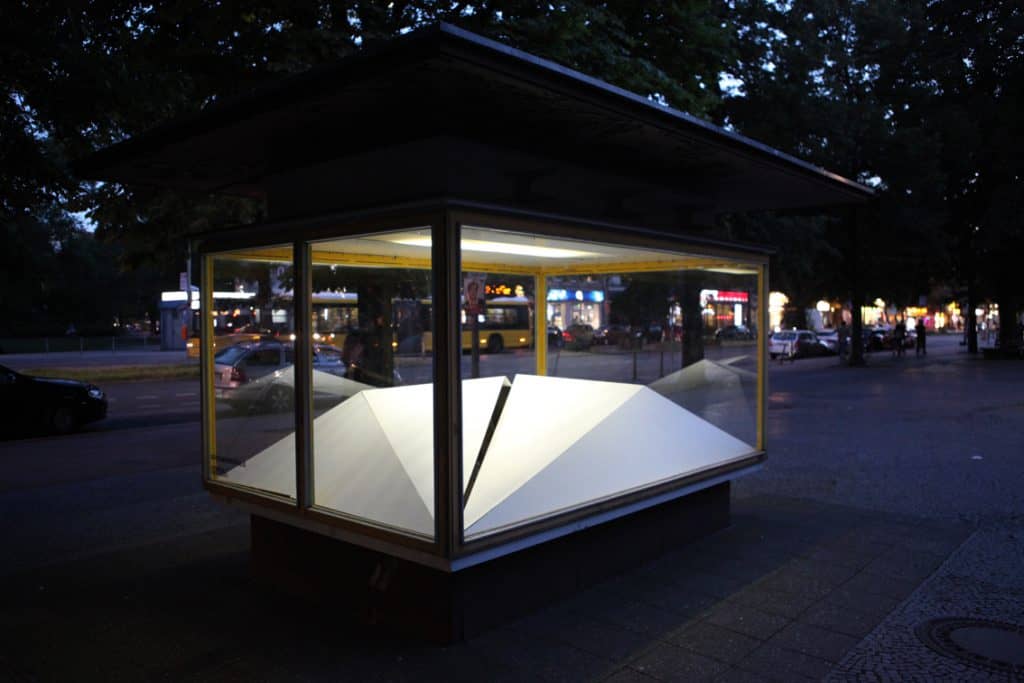Für die Vitrine vor dem Rathaus Tiergarten entwickelte die Bildhauerin eine ortsspezifische Arbeit: In dem rundum verglasten Schaukasten ist eine mehrteilige, geometrische Holzstruktur installiert, die partiell ihre Konstruktion offenbart. Mit ihrer reduzierten, scharfkantigen Form mutet die Arbeit wie ein Nachhall auf den Konstruktivismus an, lässt aber auch an einen Papierflieger, temporäre Architekturen oder eine kristalline Struktur denken.