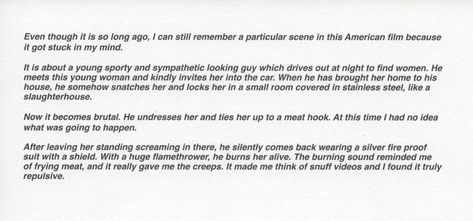 Stine Marie Jacobsen arbeitet mit Video, Performance und Text. Zentrale Themen in ihren Projekten sind Kino und Film, Gender-Archetypen, Anonymität, Tod und Gewalt sowie deren Darstellung und Vermittlung im Film.