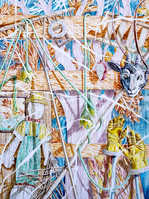 Emilie Picards filigrane Gemälde zeigen pastellfarbene Trümmer in Form von Artefakten, leeren Luftballons, alten Rohren und Kabeln, aber auch unechten Pflanzen und Sonnenschirmen. Als Ensemble wirken die einzelnen Objekte, als seien sie irgendwo vergessen oder zwischengelagert worden und wollten nun, befreit von ihrer eigentlichen Funktion, eine Geschichte erzählen – fast wie auf einer Bühne. Die Künstlerin nimmt deutliche Anleihen bei der klassischen Stillleben Malerei der Kunstgeschichte, insbesondere bei deren Vanitas-Motiven, nimmt diese aber mit Humor und bringt völlig heterogene Elemente auf einer Leinwand zusammen. Picards Bilduniversum ist stets von weißen, bröckelnden Rissen durchzogen, die den Blick beeinträchtigen und den Eindruck erwecken, dass das Gemälde selbst im Begriff ist, in sich zusammenzufallen. Dieser Zerfallseffekt wird auch durch einige Verweise auf antike Wandgemälde illustriert, die die Zeit teilweise zerschlagen hat. Ihr Werk regt die Phantasie der Betrachtenden an und lädt sie ein, den Prozess des Verschwindens von Bildern zu hinterfragen. Was bleibt übrig? Im Dialog mit ihrer Malerei präsentiert Emilie Picard eine Reihe von Bildern, in denen sie sich dem Zufälligen und Abstrakten hinzugeben scheint. In Wirklichkeit sammelt sie mit der Strenge einer Archäologin die Überreste ihrer Bilder ähnlich einem Puzzle, das wieder zusammengesetzt werden muss.