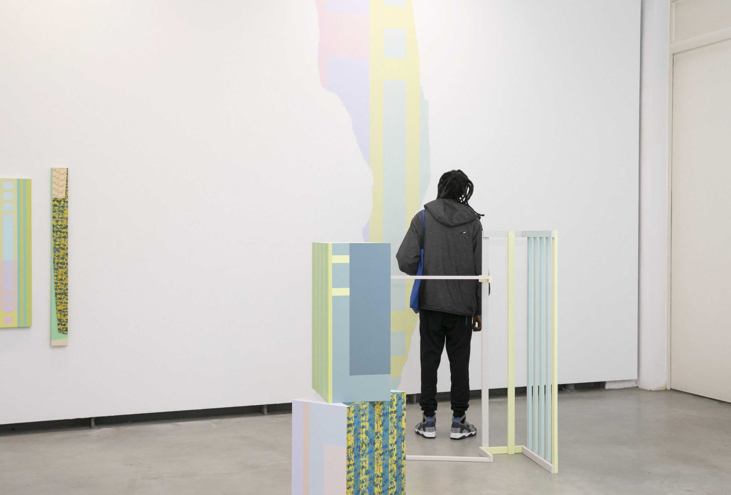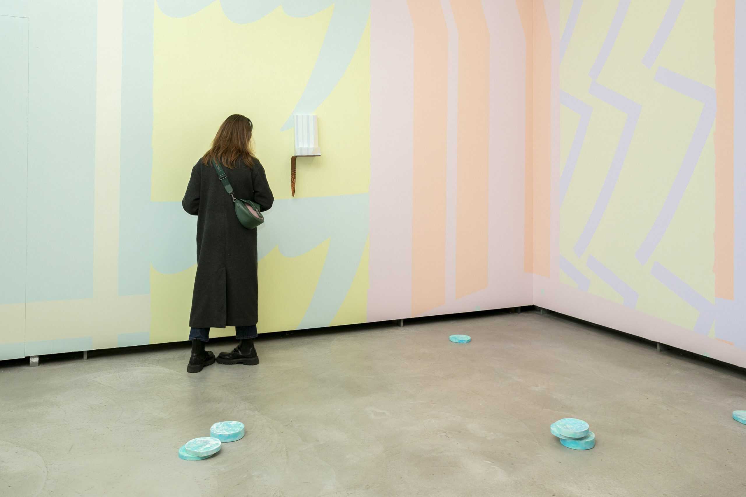 Der Titel und das einleitende Kunstwerk zeigen sowohl den Bezug zur griechischen Dichterin Sappho als auch Anleihen aus der japanischen Dichtkunst auf, von der sich die Künstlerin inspirieren ließ. Gleichzeitig setzt die Arbeit in zweierlei Hinsicht den Ton für die gesamte Ausstellung: Ton im Sinne von Farbton, denn Natsuki Oshiro arbeitet in einer ihr ganz eigenen Farbpalette, die die Ausstellung visuell zusammenhält. Ton, aber auch im Sinne der Stimmlage, der Erzählstimme. Denn die Künstlerin setzt ihr Interesse an Gedichten in visuelle Sprache um, die ihre Form in Wandgemälden, Holzskulpturen und Textilien findet. Zusammen ergeben diese Aspekte ein räumliches und gedankliches Gesamtkunstwerk, durch das sich die Besucher*innen hindurchbewegen.