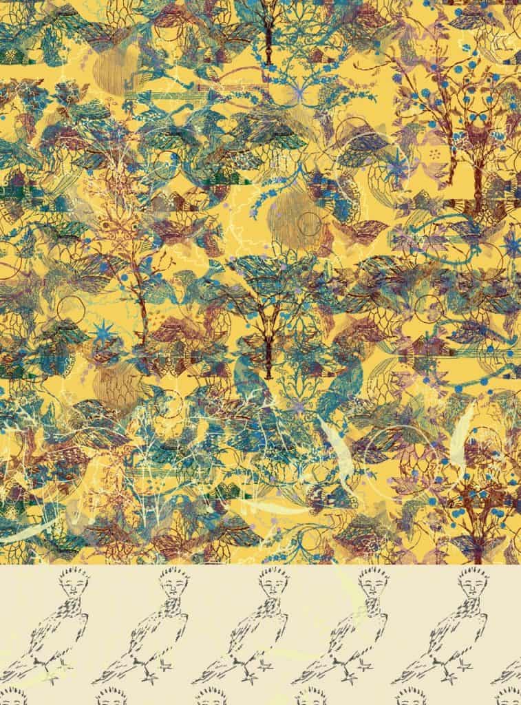 Die aufrechtstehende Arbeit in diesem Raum, zeigt schlichte abstrakte Wellenmuster auf der Seite und trägt den Titel The boat of the moon drifts into a forest of stars. Durch die Methode des Mitate (見立て) werden Materialen und Begriffe miteinander symbolisch verbunden und in Bezug zueinander gesetzt. Mitate bedeutet wörtlich „etwas als etwas anderes sehen“ oder „etwas mit etwas anderem in Bezug setzten“. Diese spielerische Methode der Imagination und freien Assoziation findet sich beispielsweise in der japanischen Gartenkunst, in der Steine und Sand etwa für Wasser und Wellen stehen.