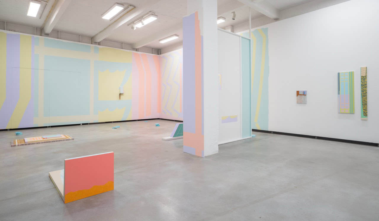 Ein Fenster, ein Ausblick oder Einblick, verspielt mit weißem Spitzenvorhang versehen, gerahmt von Pastellfarben, an der einen Seite angeschnitten das Profil einer Lyra, dem klassisch griechischen Instrument, an der anderen Seite läuft der Rahmen in eine dunkle sich wellende Form, die einem Stück schweren Stoffes gleicht. Dieses vielschichtige kleine Kunstwerk, zwischen Gemälde und Skulptur, trägt den Titel The moon was tilted No.7 (Golden-Sandalled Dawn) und leitet in die Ausstellung From the Boat Drifting Past a Forest of Stars (Der Blick von einem Boot, das durch den Wald der Sterne gleitet) der Künstlerin Natsuki Oshiro ein.