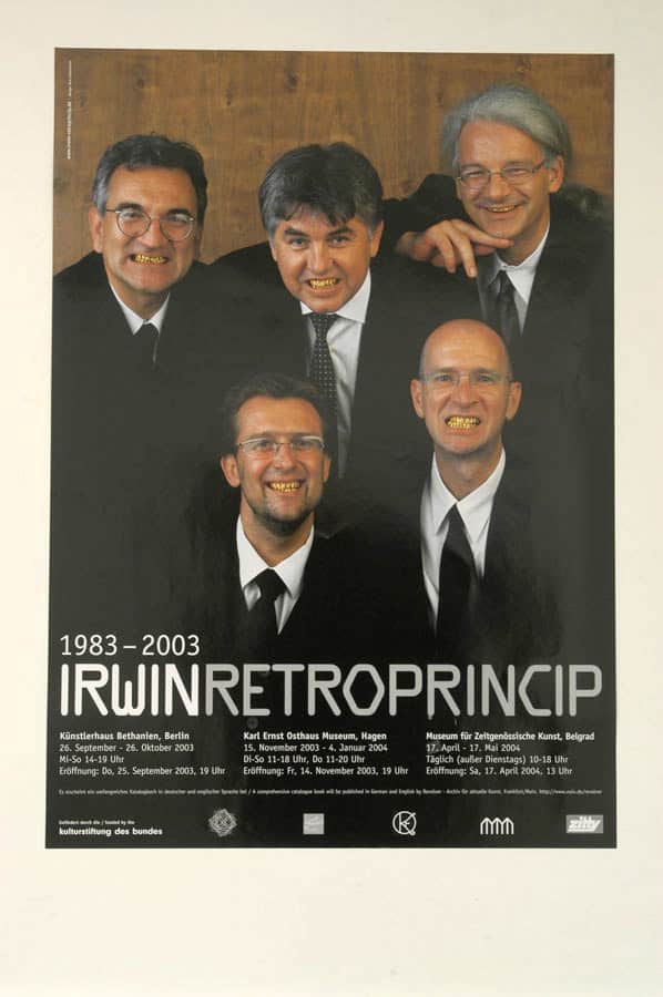 Irwin steht dabei nicht nur für eine höchst streitbare Auseinandersetzung mit den historischen Erfahrungen, Mythen und Sinnbehauptungen der Kunstgeschichte. Irwin ist auch eine Verkörperung des ‚Retroprinzips‘, einem Montageverfahren, das den Materialfundus der west- und osteuropäischen Kunst des des 19. und des 20. Jahrhunderts plündert und dabei besonders Motive aus der Kunst der totalitären Systeme und der großen Avantgardebewegungen verschmilzt. In Irwins schweren Rahmen wird so ein fiktiver ‚östlicher Modernismus‘ präsentiert, dessen synthetisch-konstruierten Oberflächen die Schemata westlicher Kunstgeschichte in Frage stellen.