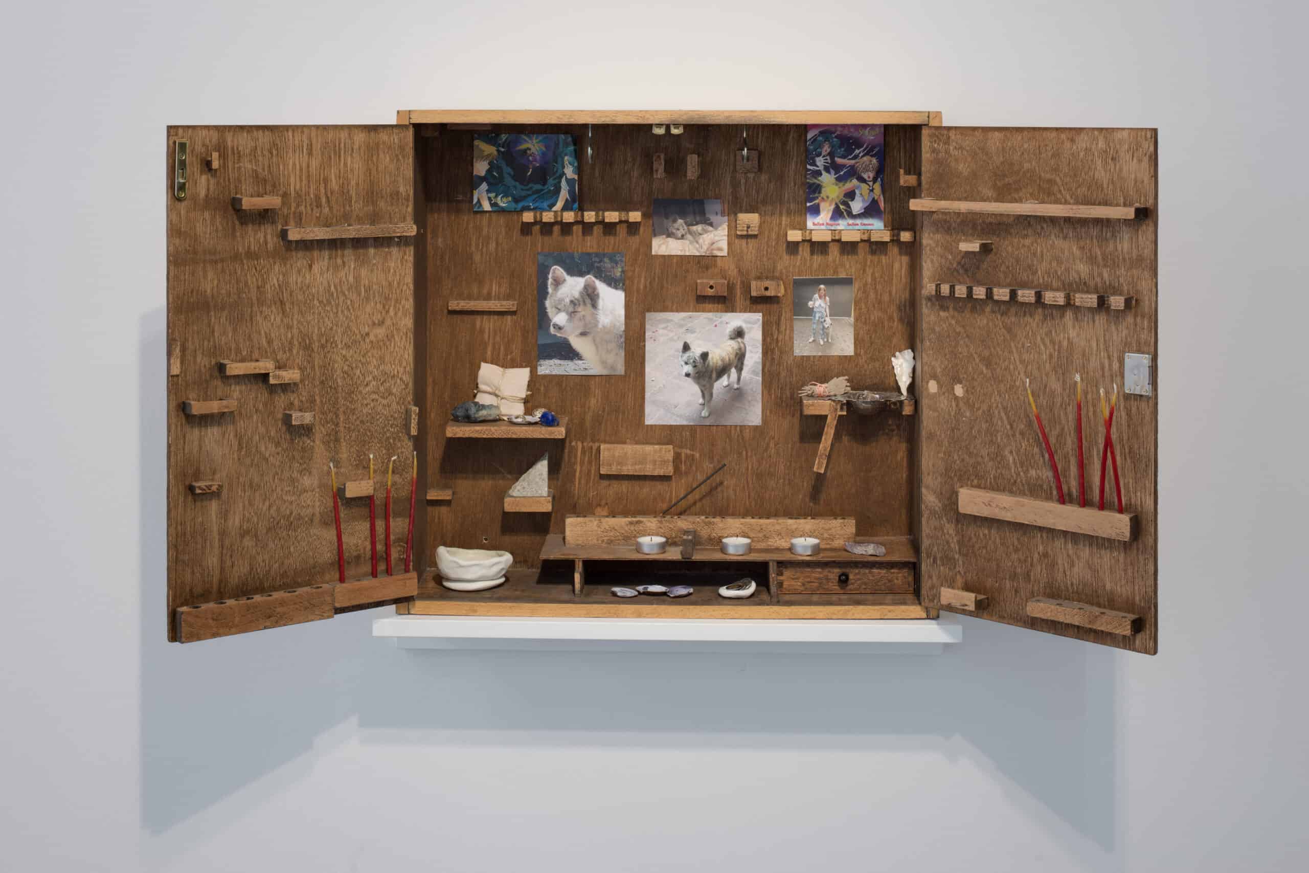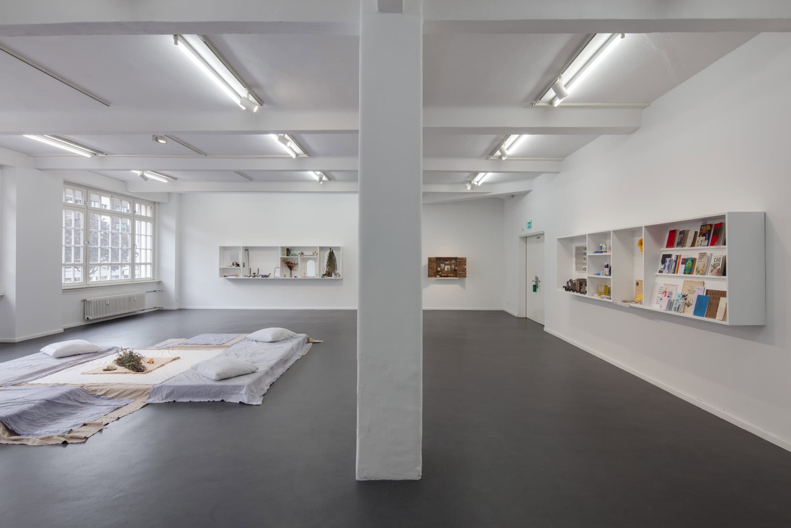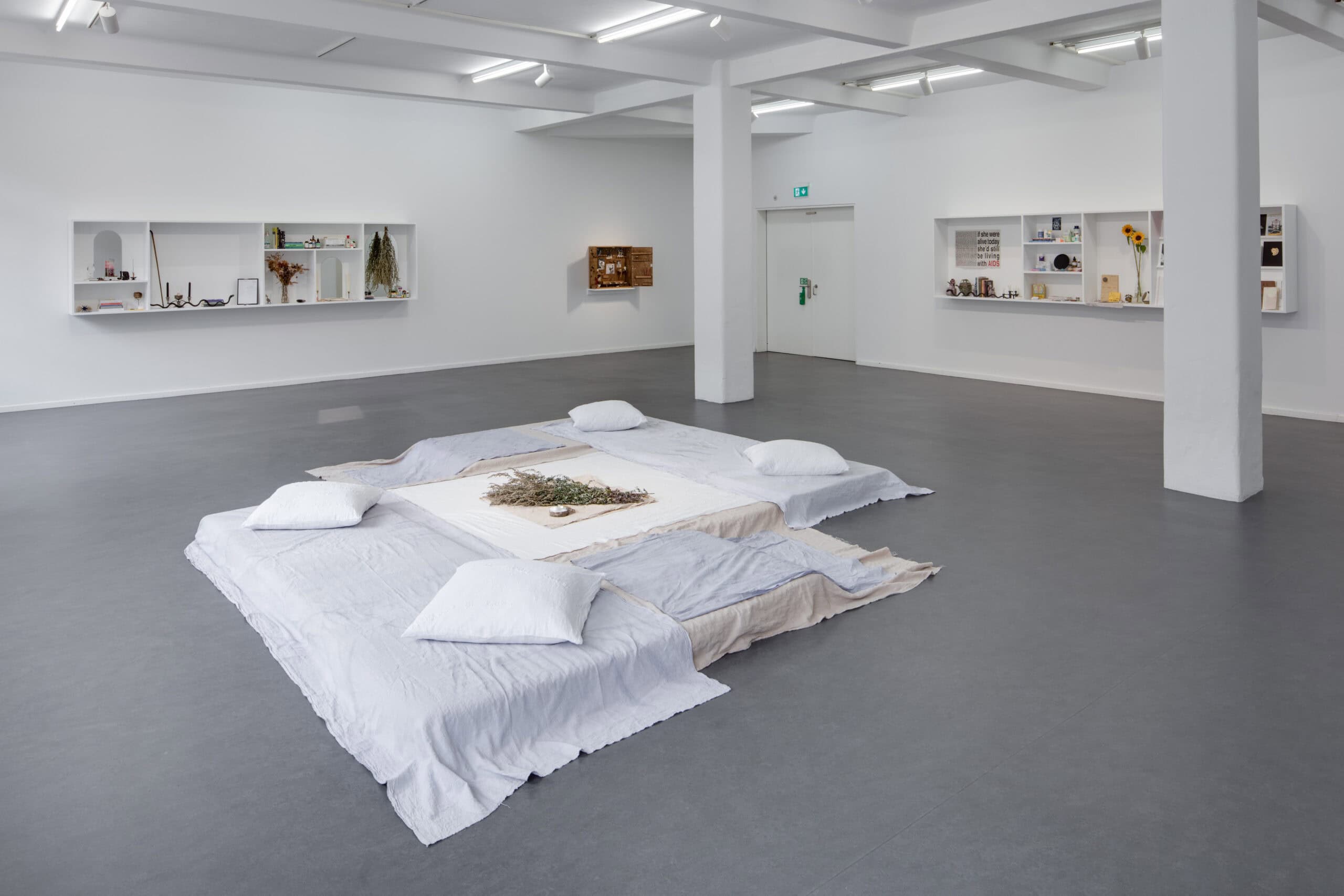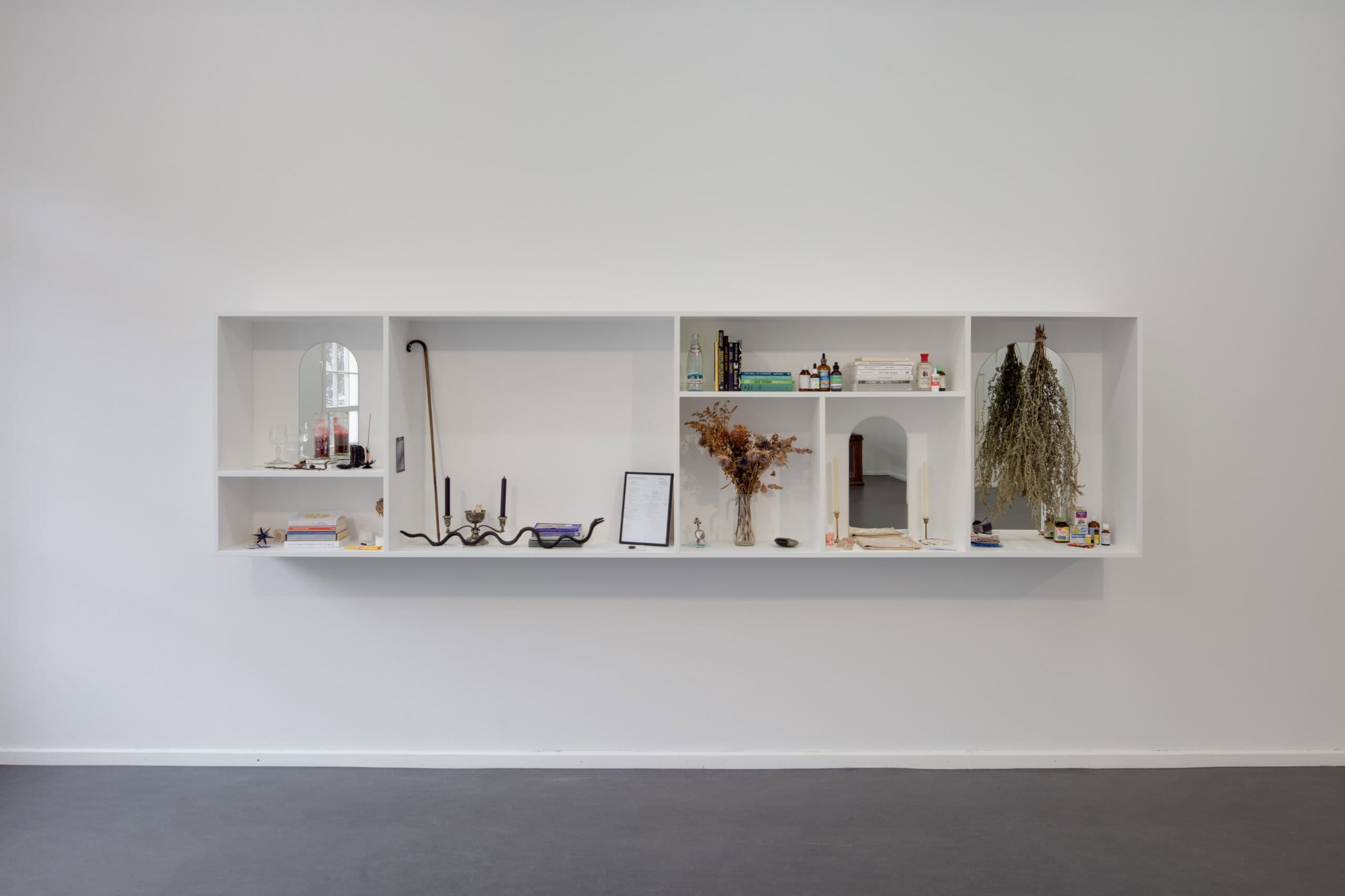 Zentraler Gegenstand der Ausstellung Visionary of Knives von Lauryn Youden sind zwei nahezu vier Meter breite Wand-Altäre. Bestückt sind diese mit getrockneten Blumen, Arzneimitteln, Kräutern, Büchern, Kerzen und rituellen Gegenständen, welche die Überlebensstrategien dokumentieren, die Youden in unserer ableistischen Welt für sich entwickelt hat. Visionary of Knives ist ein Ort des Rückzugs und der Ruhe sowie der Bildung und des Protests. Ursprünglich erdacht als Treffpunkt für queere Crip-Communities¹, wurde durch die Umstände von Covid-19 ein Raum daraus, der die physische Isolation und Abwesenheit widerspiegelt, welcher sich Menschen mit Be_hinderung² intensiviert ausgesetzt finden. Die Ausstellung trägt Youden’s persönliche Sammlung von Literatur und Magazinen zu verschiedenen Fürsorgepraktiken und Sorgearbeit queerer, be_hinderter Künstler*innen, Heiler*innen, Schriftsteller*innen und Denker*innen zusammen. Sie lädt nicht nur dazu ein, den Ursprung dieser Diskurse zu verfolgen sondern auch der Community zu begegnen, der diese gewidmet sind.
