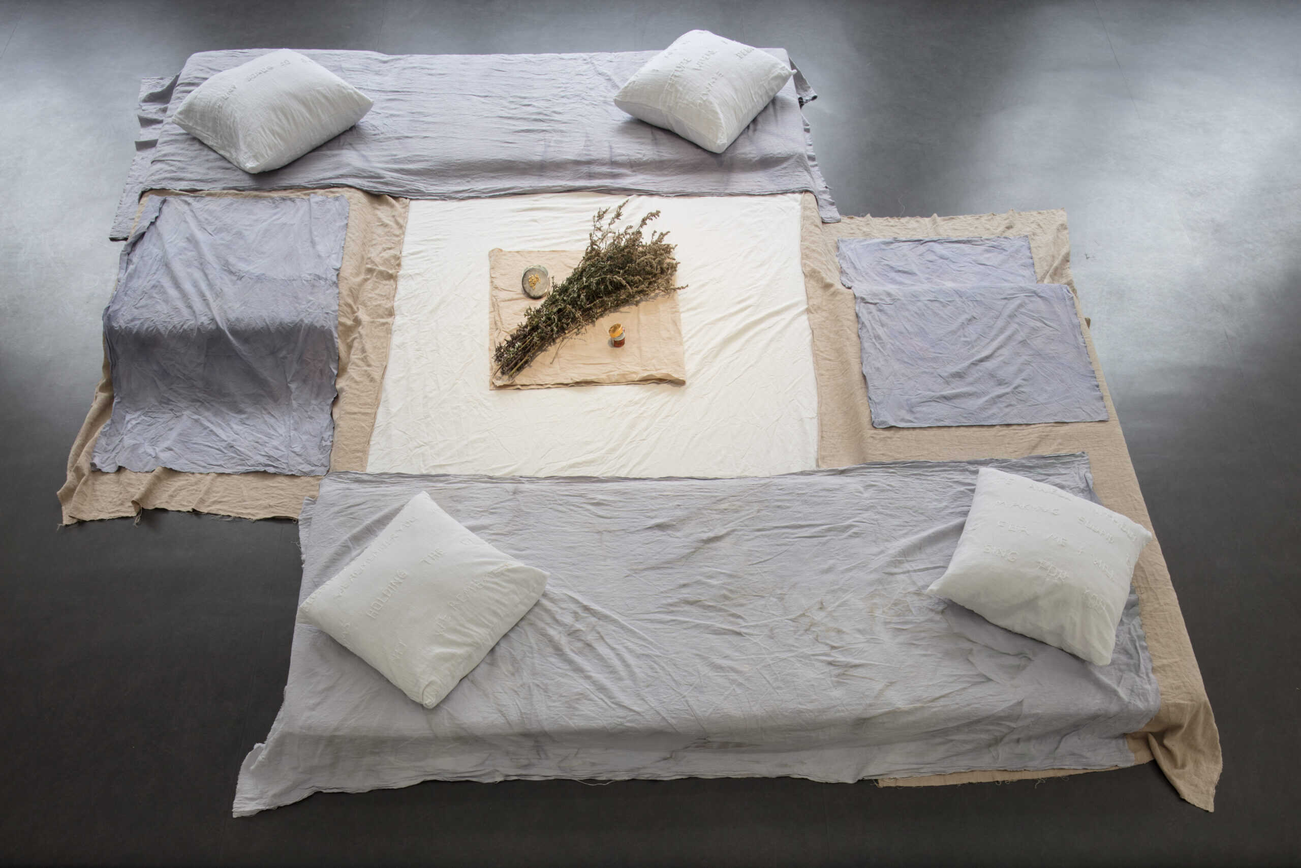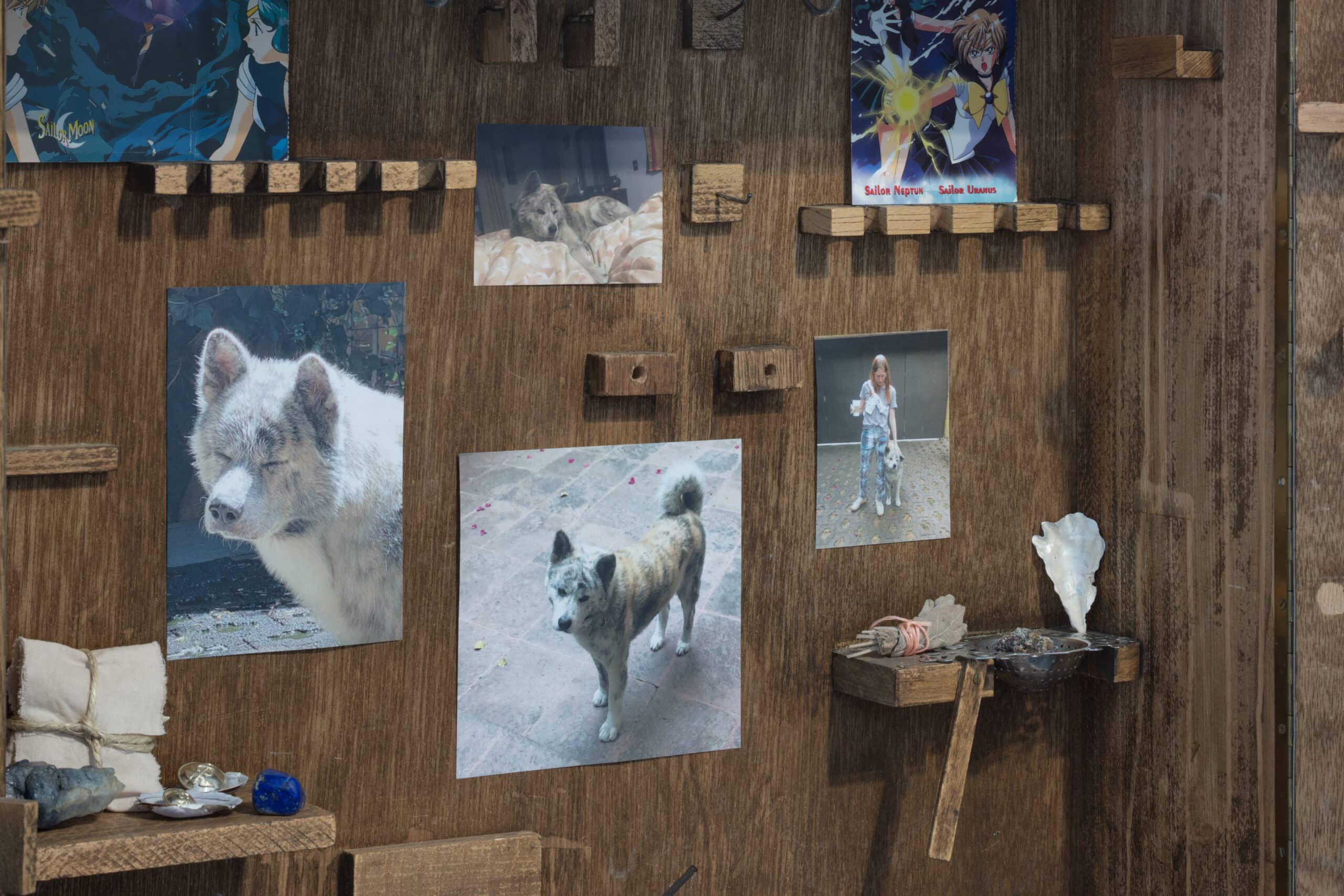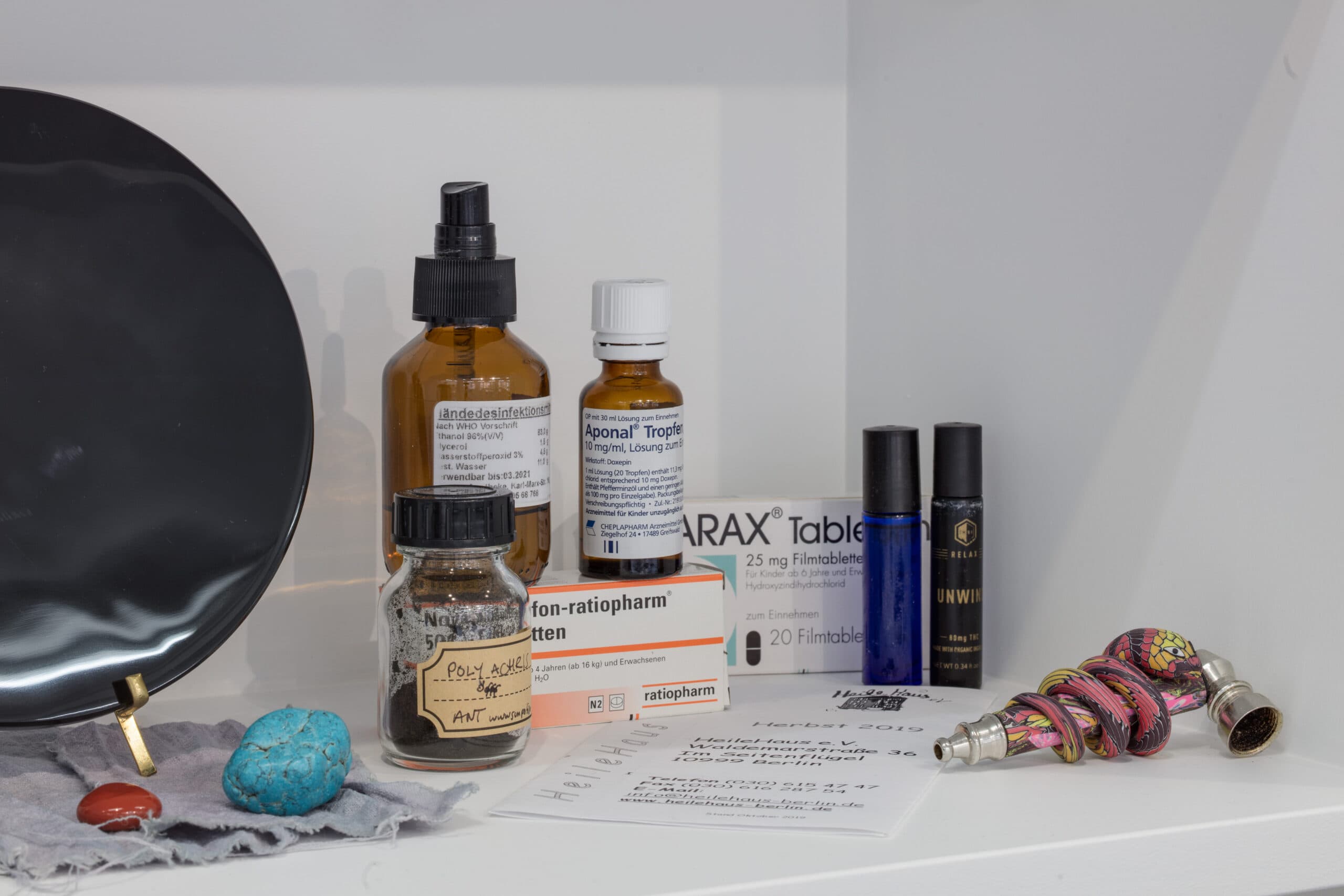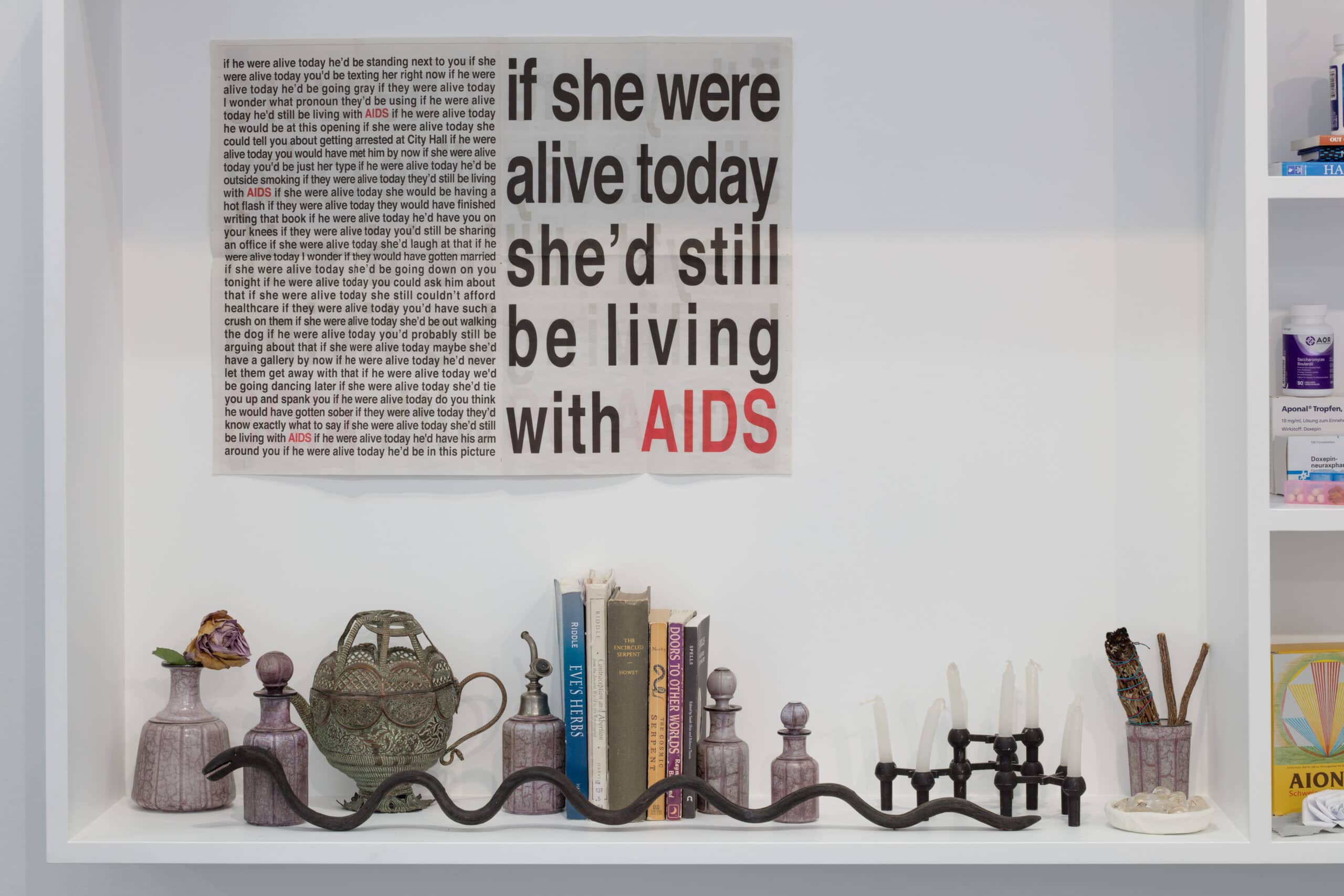 Zentraler Gegenstand der Ausstellung Visionary of Knives von Lauryn Youden sind zwei nahezu vier Meter breite Wand-Altäre. Bestückt sind diese mit getrockneten Blumen, Arzneimitteln, Kräutern, Büchern, Kerzen und rituellen Gegenständen, welche die Überlebensstrategien dokumentieren, die Youden in unserer ableistischen Welt für sich entwickelt hat. Visionary of Knives ist ein Ort des Rückzugs und der Ruhe sowie der Bildung und des Protests. Ursprünglich erdacht als Treffpunkt für queere Crip-Communities¹, wurde durch die Umstände von Covid-19 ein Raum daraus, der die physische Isolation und Abwesenheit widerspiegelt, welcher sich Menschen mit Be_hinderung² intensiviert ausgesetzt finden. Die Ausstellung trägt Youden’s persönliche Sammlung von Literatur und Magazinen zu verschiedenen Fürsorgepraktiken und Sorgearbeit queerer, be_hinderter Künstler*innen, Heiler*innen, Schriftsteller*innen und Denker*innen zusammen. Sie lädt nicht nur dazu ein, den Ursprung dieser Diskurse zu verfolgen sondern auch der Community zu begegnen, der diese gewidmet sind.