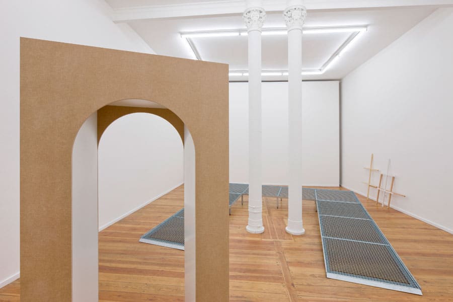 Für die Installation „No matter how hard you work…“ hat Degerman architektonische Elemente aus verschiedenen Environments nachgebaut und als skulpturale Objekte im Ausstellungsraum platziert: eine U-förmige, begehbare Metallgitterstruktur in der Art einer Rollstuhlrampe umläuft die Säulen in der Mitte des Raumes; eine Skulptur in Form einer Rundbogentür aus rauhfasertapezierten Spanplatten verweist auf ein beliebtes Architekturdetail früherer Jahre, das heute vor allem mit dem Kitsch bestimmter gastronomischer Einrichtungen assoziiert wird. Herausgelöst aus diesem Kontext, wirkt es wiederum wie ein cooles Design-Objekt. Eine weitere Komponente der Ausstellung sind aus Holz gefertigte Sprossenelemente für Fenster, wie sie einst für stilvolles Wohnen im Altbau standen: zwischenzeitlich als Plastikattrappen zum Aufkleben auf Neubaufenster zu haben, sind auch sie heute für viele in den Bereich des schlechten Geschmacks gerückt.