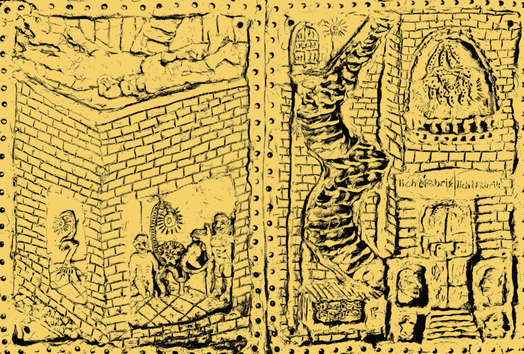 Im Mittelpunkt der Ausstellung steht ein Keramik-Relief, das eine von Männlichkeit geprägte, chaotische und diktatorische Realität darstellt. Die sich wiederholenden Szenen zweier männlicher Figuren, die in der historischen „Lichtfabrik“ kreativen Tätigkeiten nachgehen, sind von Paraden grimassierender Gestalten umgeben, so dass sich der/die Betrachter*in fragen muss, ob er/sie Zeuge einer politischen Demonstration, eines Aufmarsches oder einer faschistischen Kundgebung ist. Symbole der jüdischen Identität, wie der Davidstern und eine entstellte Menora, rufen ein Gefühl der Entfremdung hervor, das die Künstler gegenüber ihrer Heimat Israel empfinden. Noy und Tamir, die jetzt im Ausland leben, kultivieren vor dem Hintergrund der von Migration geprägten jüdischen Geschichte eine Verbindung zu den Orten, an denen sie während ihrer Residenz leben und arbeiten.