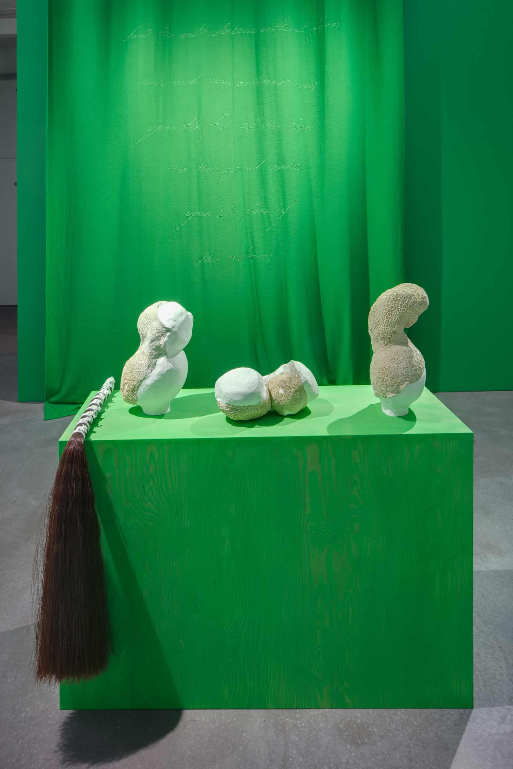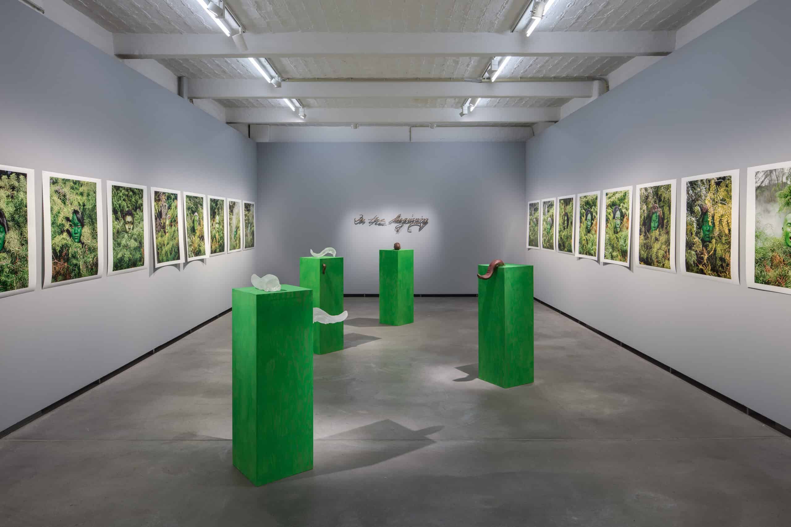 Für die Künstlerin steht die Figur des Außerirdischen, die im Titel der Arbeit und in den grünen Gesichtern der Dargestellten beschworen wird, als Metapher für Transformation und unsere zunehmende Entfremdung. Dieser Zustand wird auch im Ausstellungstitel thematisiert, der auf dem hinduistischen Sprichwort „neti neti“ beruht und sich auf große Geheimnisse bezieht, die nur durch Negierung beschrieben werden können. Derz präsentiert über 24 Fotografien aus diesem Projekt sowie eine neue Videoarbeit, die unter anderem an den Berliner Standorten Hasenheide und Botanischer Garten entstanden ist. Bei Chroma-Key-Abbildungen ist Grün die Farbe, die, meistens im Hintergrund verwendet, durch eine neue fiktive Landschaft ersetzt wird. Da die Farbe mit den stärksten Kontrast zur menschlichen Haut bietet, können Motive hier mühelos neu zusammengesetzt werden. In diesem Projekt sind die Menschen selbst grün. Das Potenzial des Verschwindens und der Transformation wird geteilt und gespiegelt zwischen Landschaft und Gesichtern. Die Videoinstallation wird von einem speziell designten Duft begleitet, den die Künstlerin als Erinnerung an den australischen Busch gemischt hat. Darüber hinaus hat sie eine Reihe von Skulpturen, darunter Bronzearbeiten, angefertigt. Eine von ihnen basiert auf Liebesbriefen, die ihr Vater, der in Berlin aufgewachsen ist und später nach Australien emigrierte, an ihre Mutter in Taiwan schrieb. Der Text lautet „Am Anfang“ und fügt so der Vielfalt der Geschichten, die während der Ausstellung erzählt werden, eine persönliche Ebene hinzu.