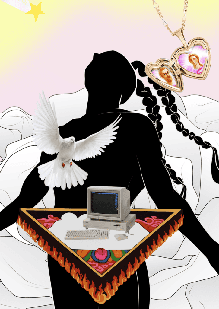 Der Collage-Prozess, der verschiedene visuelle und textuelle Materialien miteinander verbindet, erinnert an ein digitales Skizzenbuch und spiegelt die Praxis der Aneignung und Wiederholung wider, die mit der New-Age-Spiritualität verbunden ist. Zudem zieht das Werk Parallelen zu traditionellen Techniken des Nähens und der Collage, die in der viktorianischen Handwerkskunst verwurzelt sind.