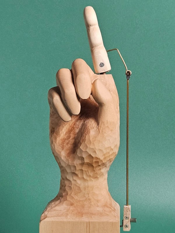 In seinem System der Dinge betrachtet der französische Theoretiker Jean Baudrillard das Technologische als etwas Abstraktes; eine Realität, der wir uns trotz ihres tiefgreifenden Einflusses auf unseren Alltag kaum bewusst sind. Indem er die mechanischen Komponenten seiner kinetischen Skulpturen freilegt, lenkt Jie unsere Aufmerksamkeit zurück auf das Innenleben der Objekte, die uns ständig begegnen. Holzskulpturen menschlicher Hände verbunden mit beweglichen Metallkonstruktionen machen lassen uns über unsere ständige Interaktion mit Technologie – und möglicherweise auch über unsere immer weiterwachsende Vernetzung und Abhängigkeit von den Maschinen, auf die wir uns täglich verlassen – nachdenken.